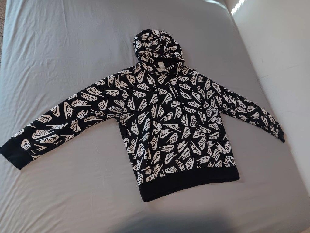 Nike hoodie with the all-over swoosh print black and white colorway. Soft, comfy, and warm. No stains, no rips, and kept in good condition.