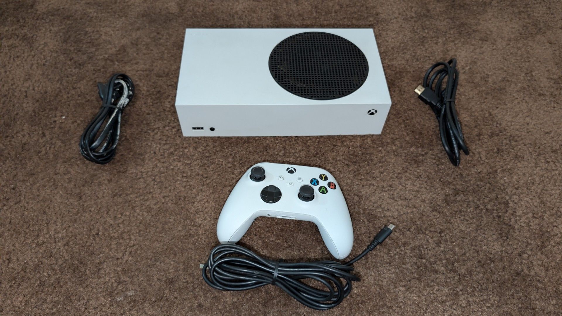 Xbox series s comes with one controller HDMI and power cable. Controller only works wired. Comes with a long USBC cable. Console works flawless no issues. Comes factory reset