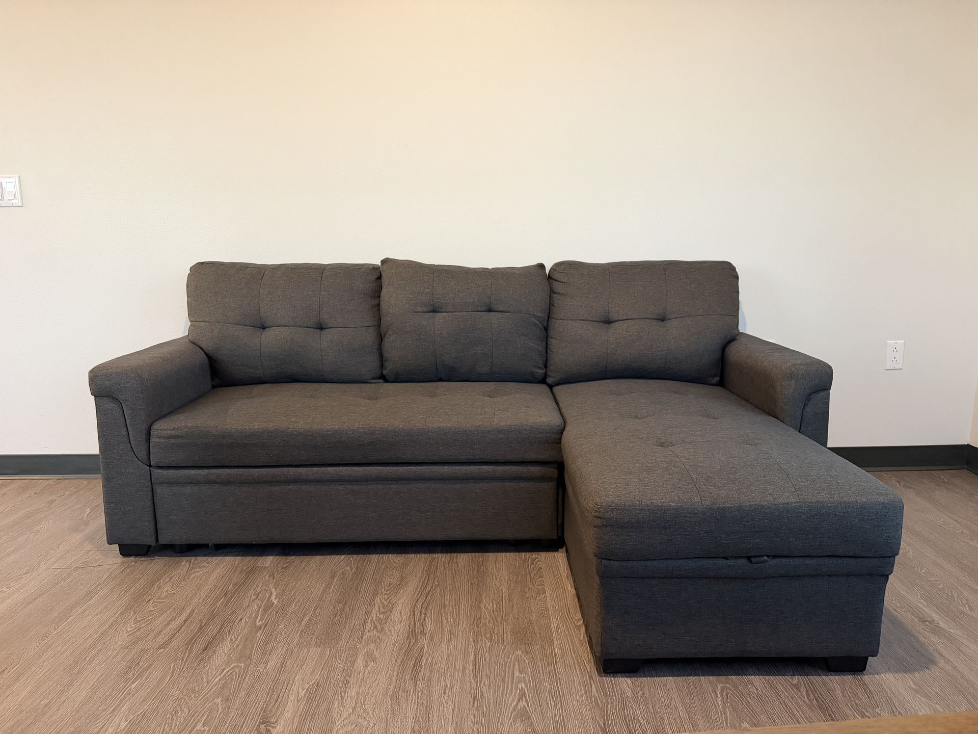Linen sleeper sofa in a dark grey, comes with great storage and is very comfortable to sit and sleep on. In excellent condition, like new. Couch was propped in different ways to give you a sense of what it can do :) Nothing wrong with it just decided I wanted a change of color. 53"D x 82"W x 34.5"H Seat depth: 19.2” Seat height: 17.5” Available for pick up and or delivery for a fee!
