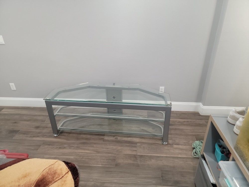 Free glass entertainment / tv stand. Its 58 inches long by 23 inches tall, with a Depth of 19 3/4 inches . The glass shelves can be individually removed while moving to make it lighter.