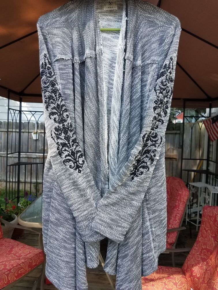 This is a french terry open front cardigan. I bought this on vacation in Nashville. The sleeves are very beautiful with rhinestones. It has never been worn. Only tried it on. Size medium. #10