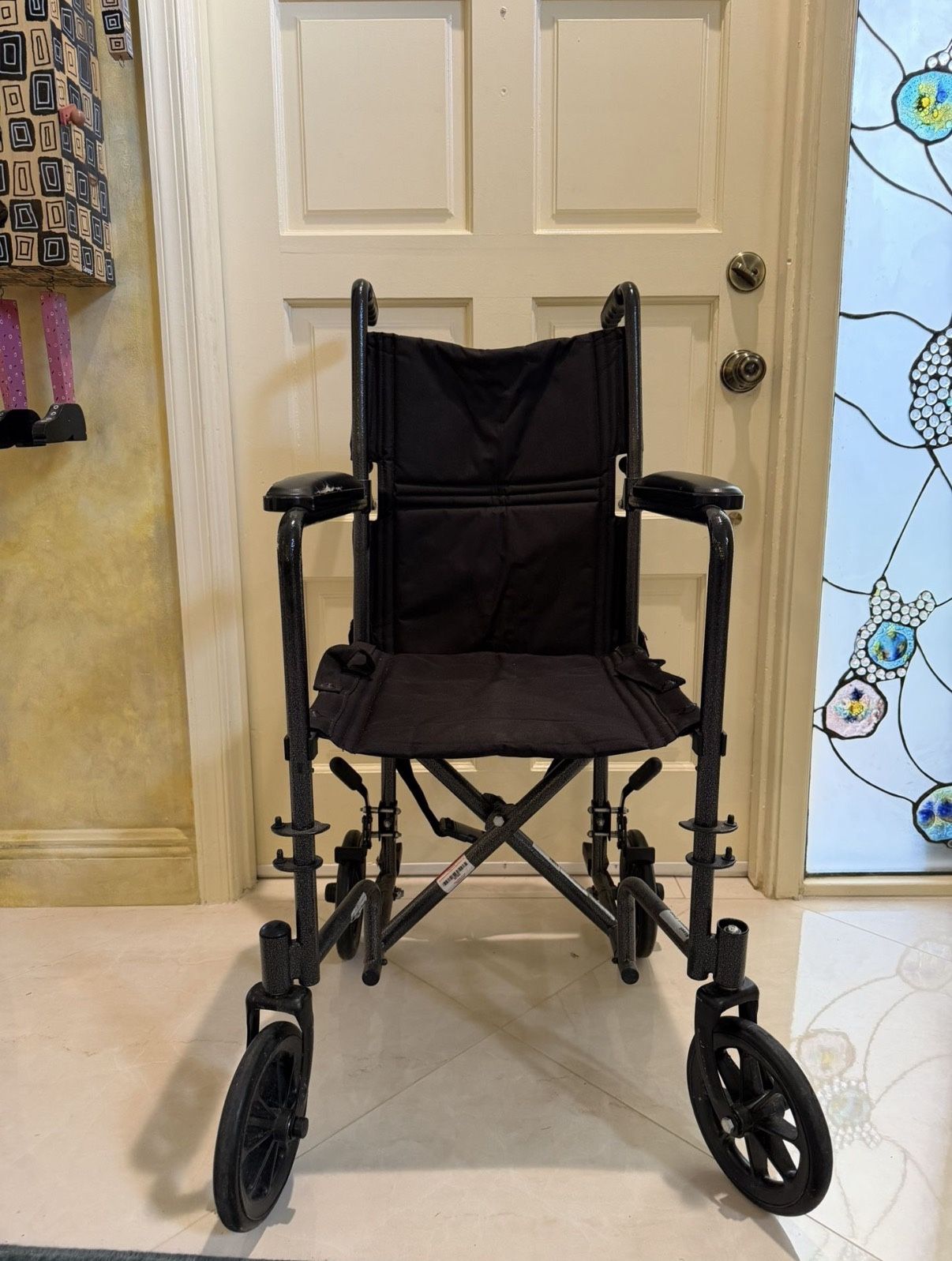 JUST REDUCED! This lightweight black transport wheelchair is compact, sturdy, and easy to maneuver - perfect for travel, doctor visits, or daily mobility. It folds in seconds for storage or transport and offers excellent comfort and safety. Features: - 17-inch wide seat for a comfortable fit - Built-in seatbelt for added security - Lightweight folding frame for easy transport and storage - Durable black steel construction with padded seat and backrest - Ergonomic push handles and locking rear wheels for safety - Compact design fits easily in most car trunks In good condition, with only minor wear on one armrest. Fully functional and ready to use. Ideal for caregivers or anyone who needs a reliable, portable mobility chair.