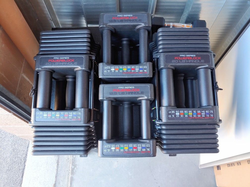 Powerblock Pro 125 Commercial set with everything listed below. Measuring just 21.5” x 25”, this single set of adjustable dumbbells is equivalent to owning 18 traditional pairs. Weight Range: 12.5 to 125 LBS per hand in 7.5 LB increments Increments are: 12.5, 20, 27.5, 35, 42.5, 50, 57.5, 65, 72.5, 80, 87.5, 95, 102.5, 111, 120 and 127 LBS per hand Replaces 16 pairs of dumbbells or 2,211 LBS of free weights Includes 2 sets of 12.5 and 20 LB handles with contoured TPR comfort grips Assembled commercial stands included Cash, Venmo or Paypal only. Please let me know if you have any additional questions regarding this PowerBlock set and I look forward to showing you them.