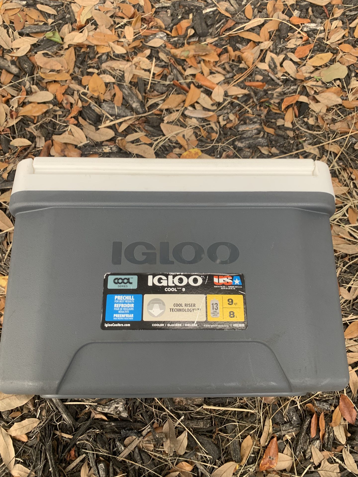 9qt, 8 L cool series igloo cooler. Holds 13 cans. Perfect cooler to hold your drinks or snacks for a picnic. Has little scratches & is cleaned.