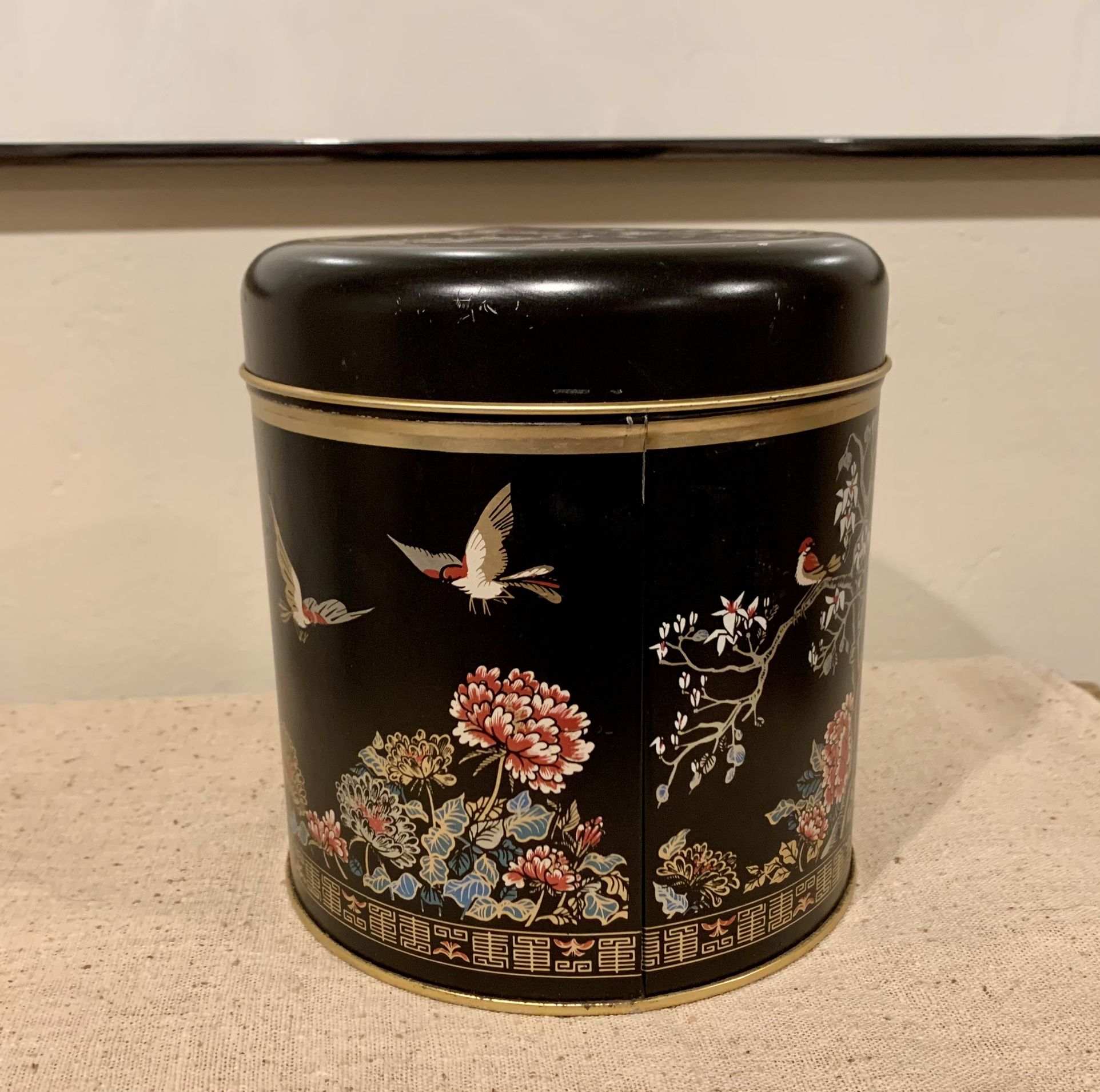 Vintage chinoiserie style tin canister. Black background with gold, burgundy, green and cream accents/art. 6.75 inches tall by 6 inches in diameter. Rust free, clean inside and out. Smoke free home.