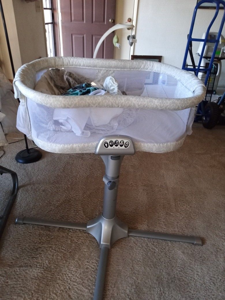 For infant/baby up to 20lbs be able to sleep right up next to your bed. Side pulls down for easy access, buttons for sounds, vibrations, nightlight, and a nursing timer. Comes with extra bedding. Gently used and in great condition. Easy to use and swivels making it easy to get in and out of bed.