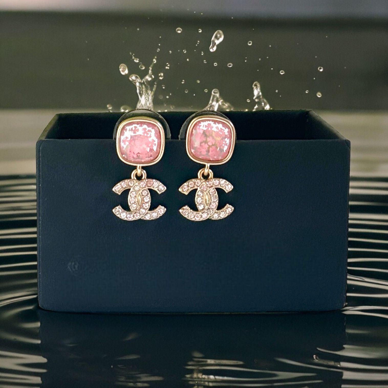 Authentic Chanel Lighter Gold , Pink with Mirrored Print with Crystals CC Dangle Post Earrings Was gifted to my Sister who wore them 1 time and I’m selling them for her here. Comes with the Chanel Box & Gift Bag Free from any signs of damage or wear Reduced - buy more to get a bigger discount