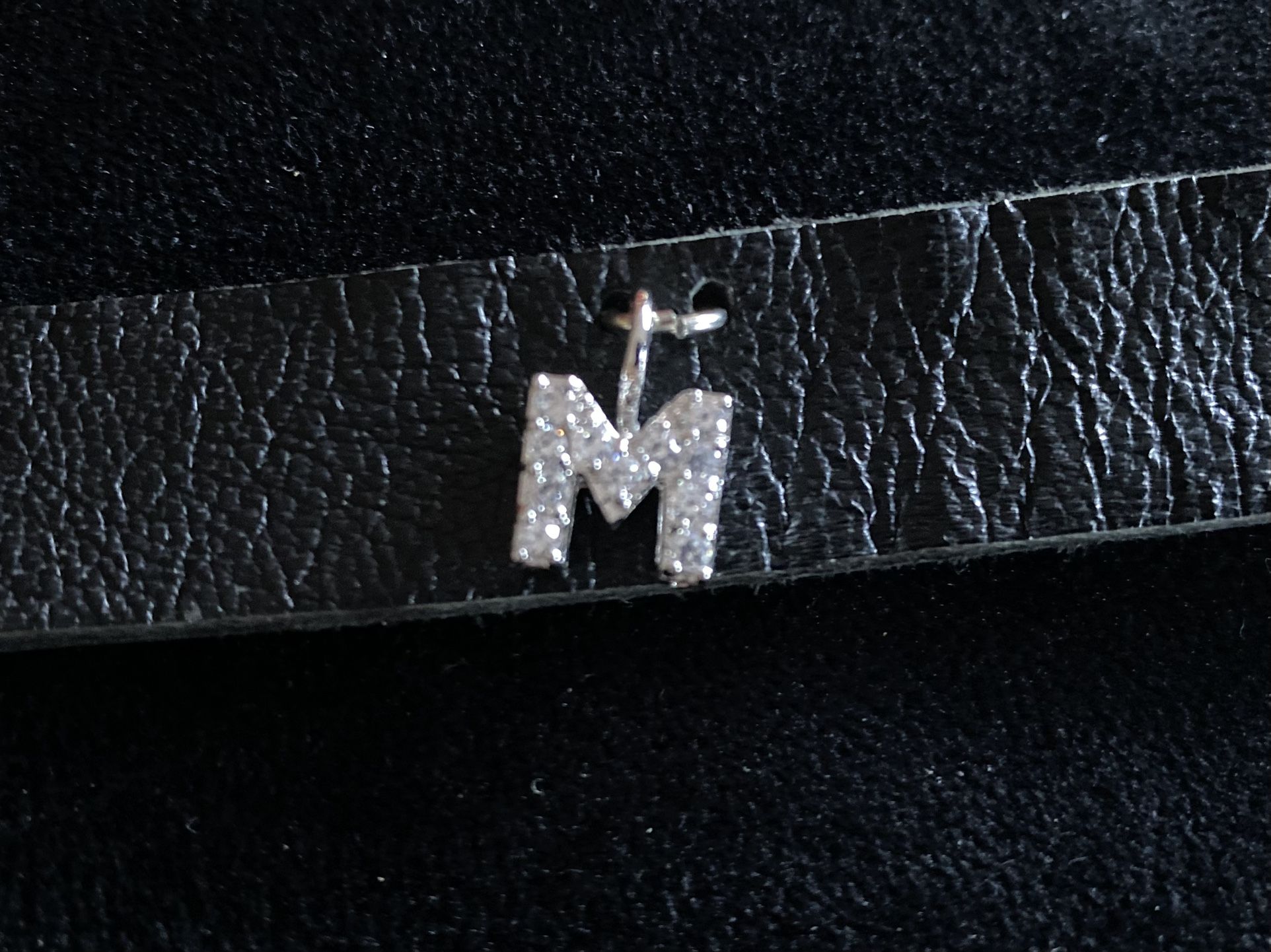 Above is a woman’s leather choker with a M which is marked silver with cubic zirconia diamonds. Also, there are two mercury, silver dimes as buttons. These are real dimes that were turned into buttons. If you have any questions, let me know.