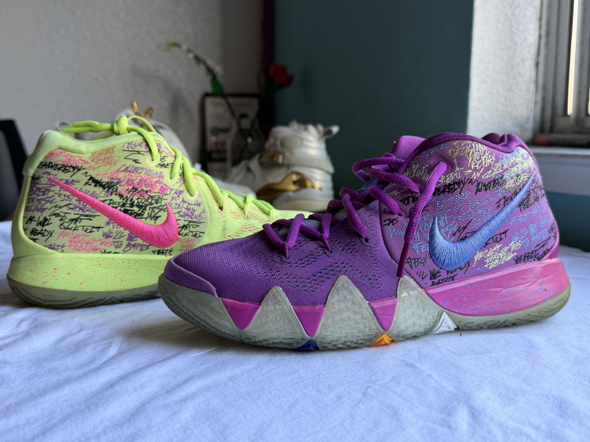 Colorful Nike Kyrie 4 sneakers. One shoe is purple with pink accents and a light blue swoosh. Other shoe has neon yellow and pink colors with a pink swoosh. Both have a cool graffiti-like design. Good for basketball or just to wear around. Worn Super clean condition No box Pick up Cash only