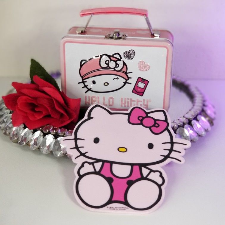 Too cute! Sanrio Hello Kitty Metal Tin Lunch Box : Hello Kitty Fashionista wearing pink hat with bow and iher cell phone. Includes metal flip lock. Cute Design all over. Officially licensed. manufactured by The Tin Box Company. Package Quantity : 1 metal clip to open and close plastic handle * New with Tags * Tin Metal Linch Box * Hello Kitty * Sanrio #HelloKitty,#Lunchbox,#Tin Can