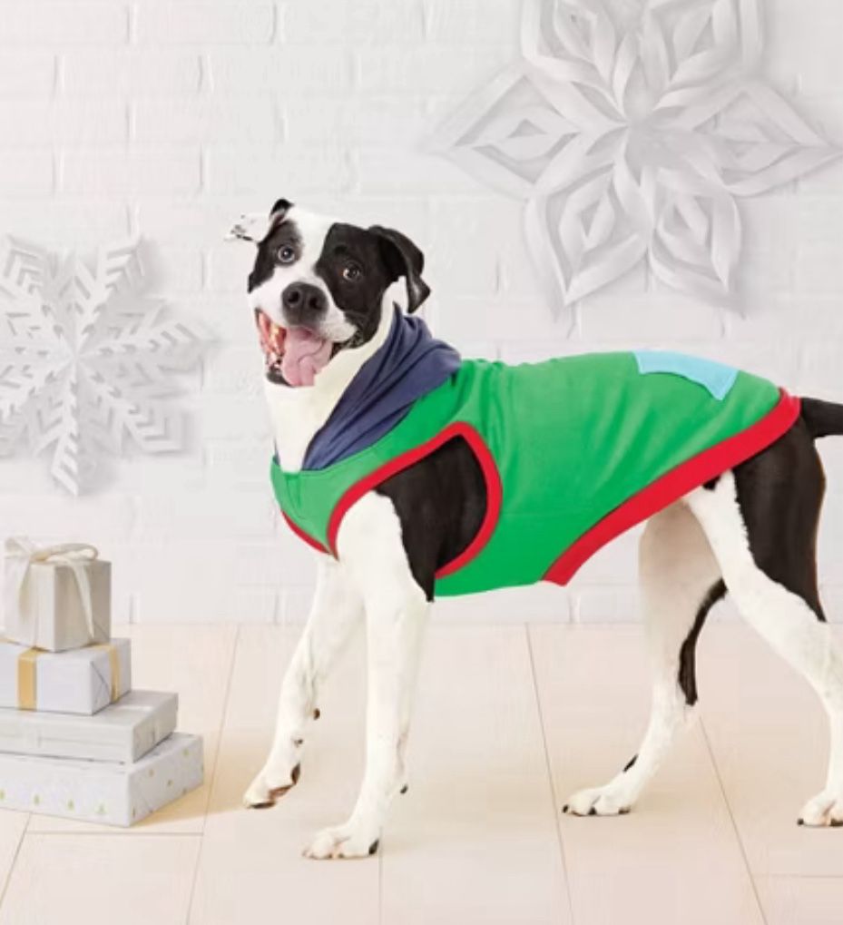 🎄🐶 Wondershop™ Colorblock Dog Hoodie 🎁✨ Keep your pup cozy and stylish this season with the Wondershop™ Colorblock Dog Hoodie! ✅ Made from 100% polyester – soft, comfy & durable ✅ Festive colorblock design – Green body, Red trim, Blue patch, & Navy hood 🎨 ✅ Easy hook-and-loop closure – hassle-free dressing 🧵 ✅ Machine washable – simple cleanup after winter adventures 🧼 ✅ Size: Large (fits dogs up to 80 lbs) 🐕 Neck size: 10–14 inches Chest size: 14–16 inches 🎅 Perfect for holiday photos, chilly walks, or just looking extra cute by the fireplace! 💲 Price: $10.00 ⸻ ✨ Colors: • 🌲 Green (main body) • 🔴 Red (trim) • 🔵 Light Blue (patch) • ⚫ Navy (hood) 🐾 Give your furry friend the gift of warmth & holiday cheer! 🐾
