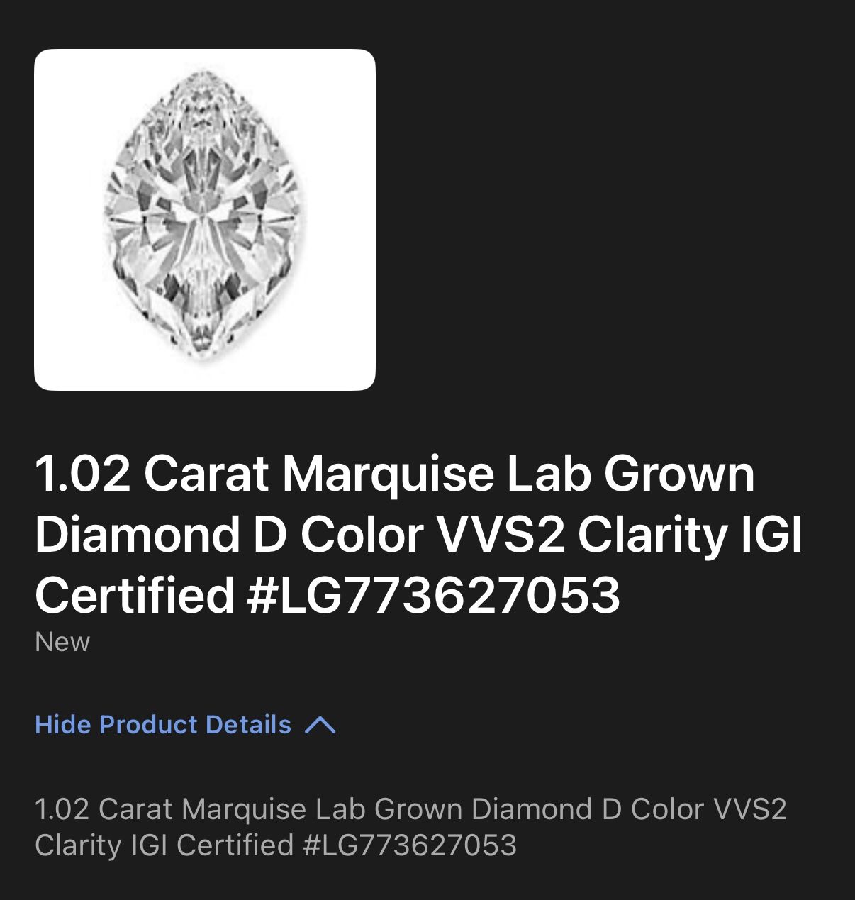 This product is a 1.02 carat marquise lab grown diamond with a D color and VVS2 clarity. It is a stunning and elegant diamond stone that can be used in various styles of jewelry such as chain, locket, tennis, lariat, fringe, statement, layered, choker, station, pendant, charm, beaded, Y-drop, bib, and collar. It is rated 10/10 and comes from the International Gemological Institute, making it a high-quality and premium piece of jewelry that is perfect for those who appreciate art and fashion aesthetics.