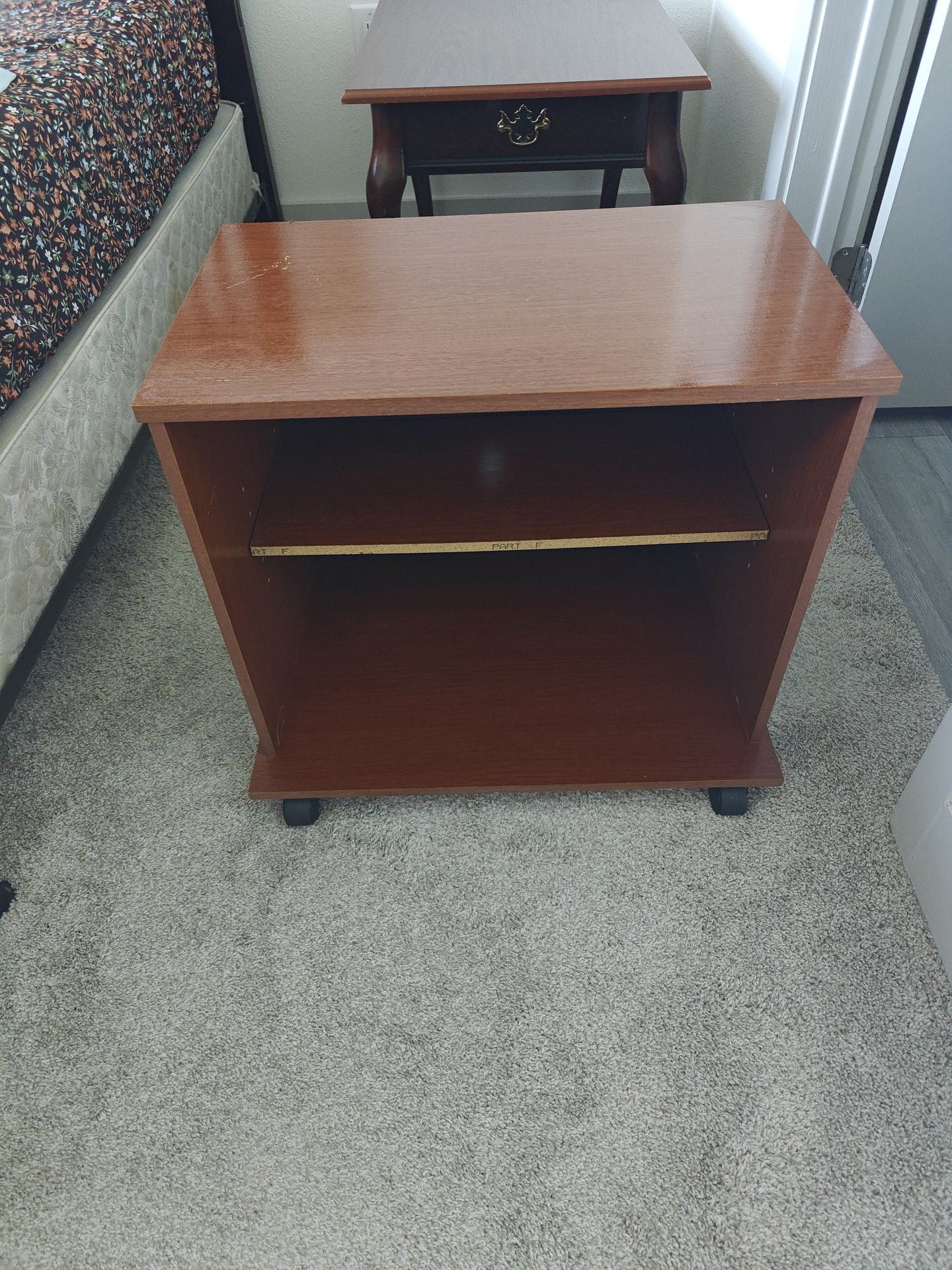 A multipurpose side table with wheels, can be used as a bedside stand, printer stand, or TV stand. In excellent condition. . From a pet free, child free home. Selling due to moving in a few months