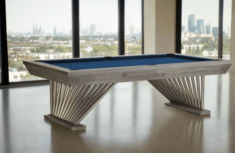 Brunswick Brescia 8' Pool Table Explore the allure of the Brescia 8' Billiard Table, inspired by the artisanal elegance of its namesake city in Italy. Its captivating design features a base reminiscent of the harmonious strings of a harp, crafted from cylindrical metal uprights with a luxurious champagne bronze finish. Complemented by angled aprons in a rich, dark charcoal, this table combines beauty with functionality, featuring polished stainless steel rail sights and low-profile drop pockets seamlessly integrated into its sleek design. Includes new standard cloth, any color Includes playing equipment Simonis professional cloth available Contact us or visit DrBilliards. com Delivery and professional installation available 1321 Ne 163rd st North Miami Beach 33162 Open 7 days by appointment