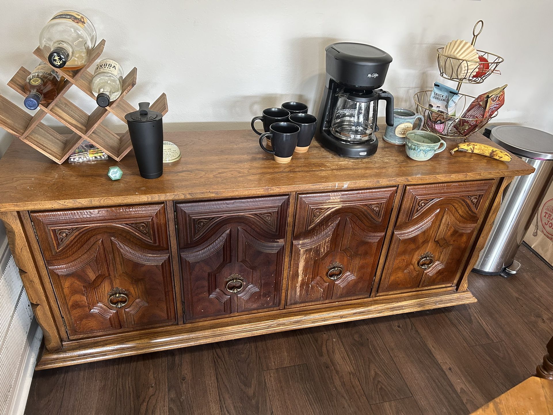 Perfect station for coffee, alcohol display, and storage with four cabinets. It does have several stains, but would be easy to repaint. Cash only please - price negotiable.
