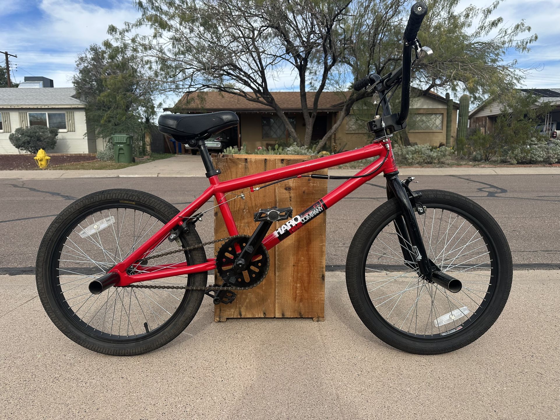 The bicycle is a Haro F1 model BMX bike from the mid-to-late 2000s, This model was part of Haro's F-series of freestyle BMX bikes. Key Features and Specifications Frame: It features a steel frame, as was standard for the F1 model during that era. Wheels: The bike has 20-inch wheels with 36 spokes, and it includes four pegs, two on each axle, which are typical for freestyle bikes. Braking: It is equipped with U-brakes, which are common on BMX bikes, and appears to have a cable detangler (gyro) system visible near the handlebars, allowing for bar spins. Color: The frame is a vibrant red with "HARO COMPANY" decals on the downtube. The Haro F1 was designed as a beginner-to-intermediate level freestyle BMX, suitable for street, park, and dirt track riding.