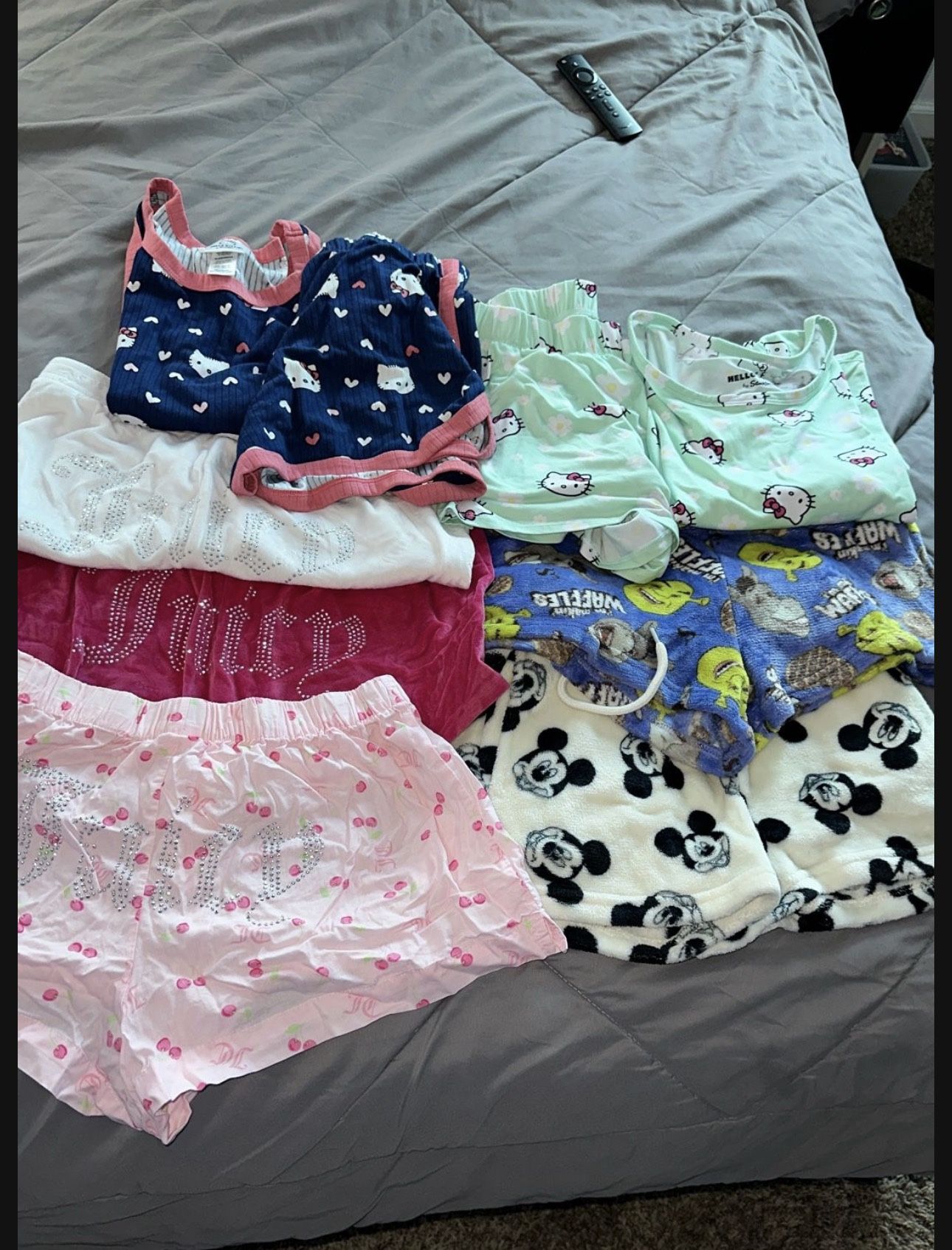 Women’s size medium sleep wear PICK UP ONLY 2 sets of hello kitty pjs 3 juicy couture pj bottoms Shrek pj bottoms mickey pj shorts Total of 7