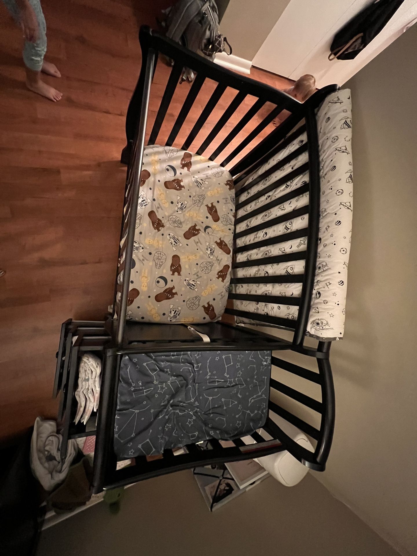 Yr old , black mini crib with changing table , which can turn into a night stand. Mattress and mattress cover. The bedding is not for sale