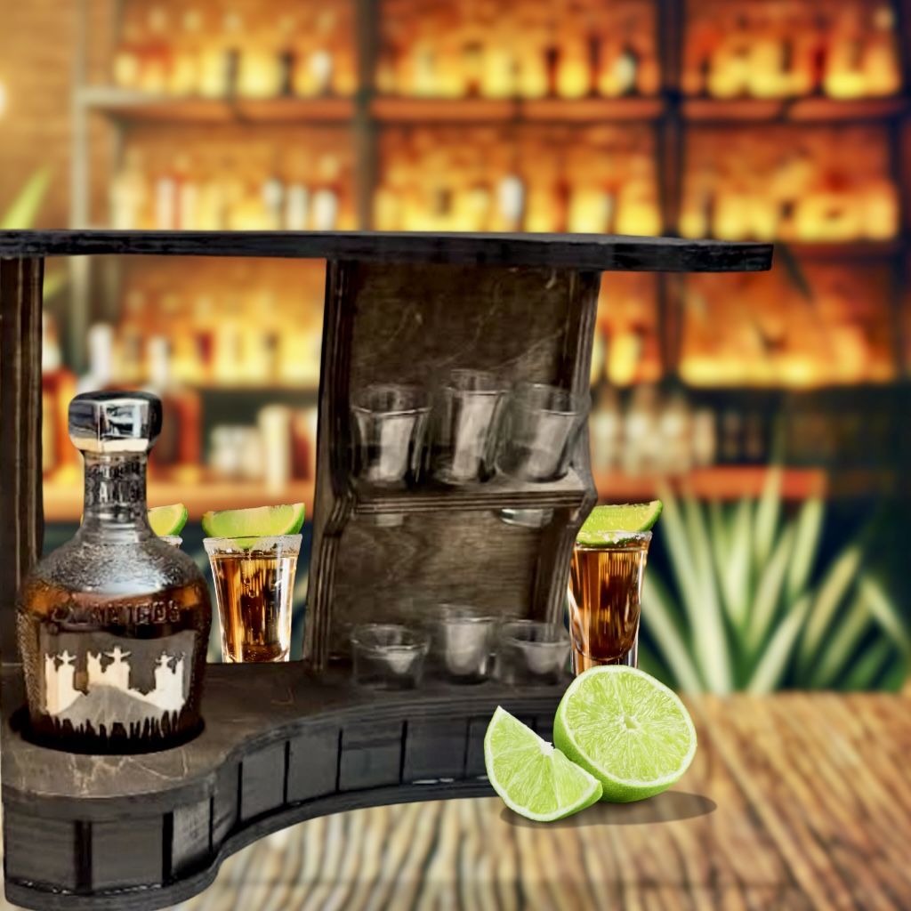 Elevate your hosting experience with this handmade wooden tequila bottle and shot glass holder. Crafted with precision and a rustic charm, this unique display piece is designed to hold your favorite tequila bottle and up to six shot glasses securely. Features: • Handmade from high-quality wood for durability and style. • Fits one tequila bottle (750ml) and six standard shot glasses. • Compact and portable, perfect for entertaining or gifting.