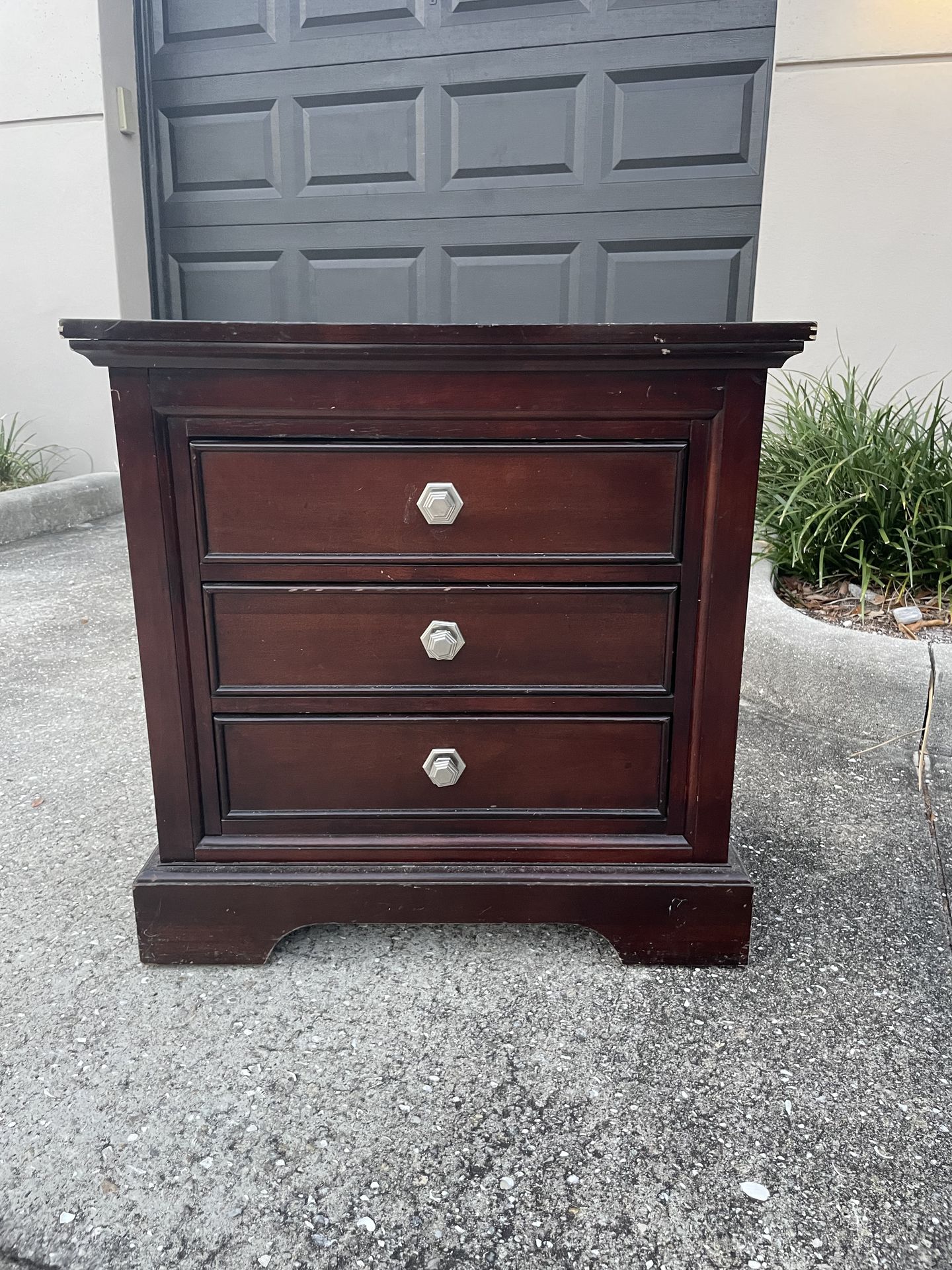Nightstand with dark wash wood. Three drawers knobs. Few scratches