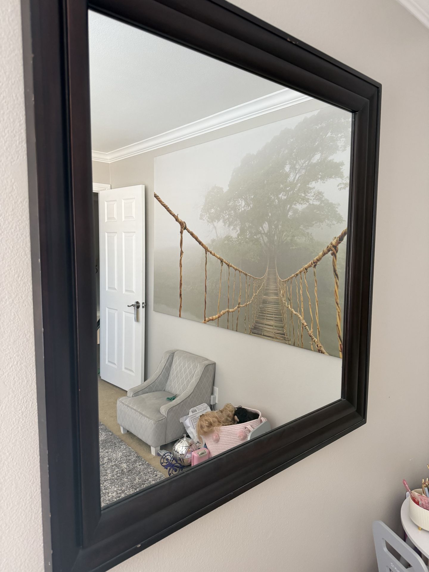 Decorative mirror with dark brown wood frame. 42”w x 44”h. Cash, Venmo or Zelle accepted.