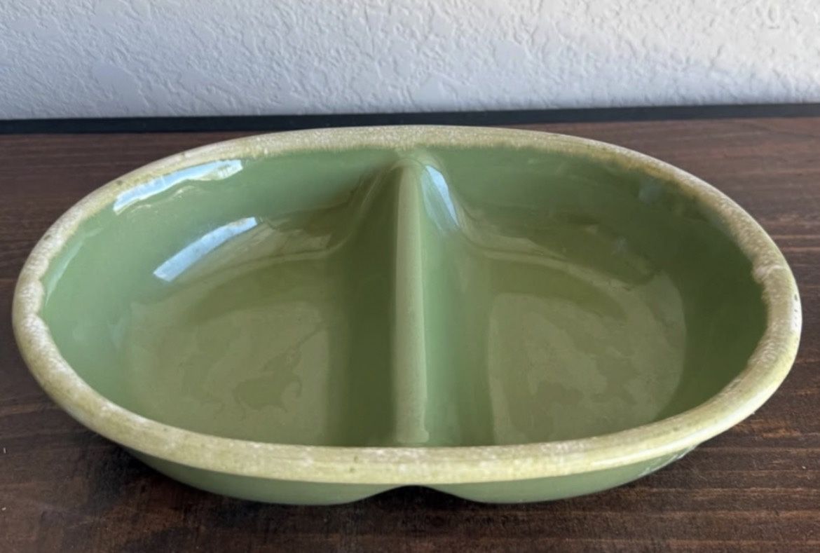 Mid-Century Hull Pottery Avocado Green Divided Serving Dish