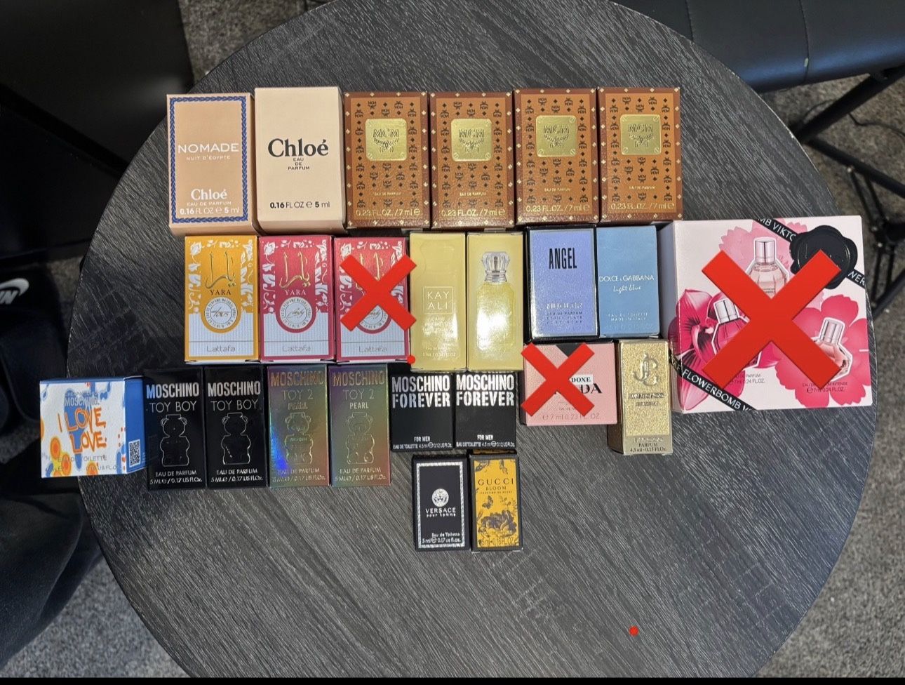 🌸 AVAILABLE SCENTS INCLUDE 🌸 $10 If 5 or more are purchased prices will be $8 each KayAli Capri In a Bottle Lemon Sugar $22 Chloé Nomade Nuit d’Égypte 0.16 oz / 5 ml Chloé Eau de Parfum 0.16 oz / 5 ml Dolce & Gabbana Light Blue 0.17 oz / 5 ml Mugler Angel 0.17 oz / 5 ml Gucci Bloom 0.16 oz / 5 ml Capri in a Bottle 10 ml / 0.34 oz Yara (tropical & candy) 7 ml MCM Eau de Parfum 0.23 oz / 7 ml Versace Pour Homme 0.17 oz / 5 ml Moschino Toy Boy 0.17 oz / 5 ml Moschino Toy 2 Pearl 0.17 oz / 5 ml Moschino Forever (Men) 0.15 oz / 4.5 ml Viktor & Rolf Flowerbomb mini set (3 minis) 7 ml each Moschino I Love Love (EDT mini) 0.17 oz / 5 ml Y YOU’LL LOVE THESE ✨ ✔ Authentic designer fragrances ✔ Perfect travel & purse size ✔ Great for gifting or sampling ✔ Limited quantities available 📩 DM to claim or ask about bundle pricing 🚚 Bundled shipping available ❌ All sales final