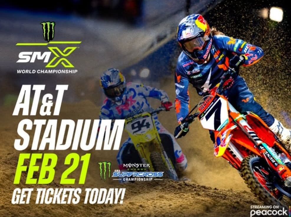 MONSTER ENERGY AMA SUPERCROSS SAT • FEB 21, 2026 • 5:30 PM AT&T STADIUM, ARLINGTON SRCTION 409 ROW 21..$45 EACH SECTION 329 ROW 10 $80 EACH SECTION 246 ROW 12 $105 EACH SECTION 121 ROW 22 $130 EACH PAYMEMT PLAN ON VIP TIX ONLY SEC 114 SEAT WITH OPEN BAR AND BUFFET $295 EACH