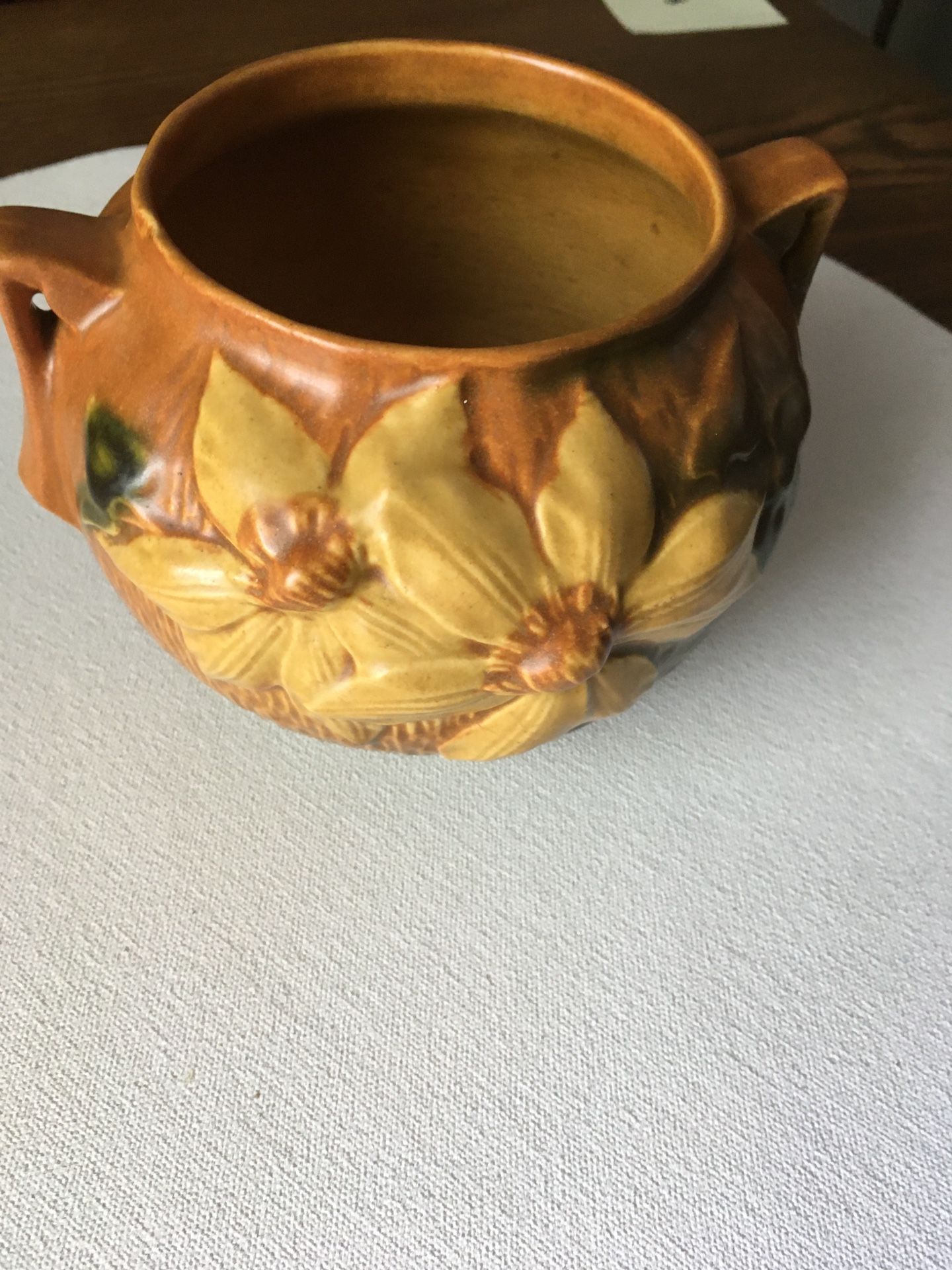 Pristine / perfect condition. 4 1/2 inches high 6 inch diameter outside and opening is 3 1/2 inches Decorative floral pot/bowl with handles. Seen on eBay for $50.