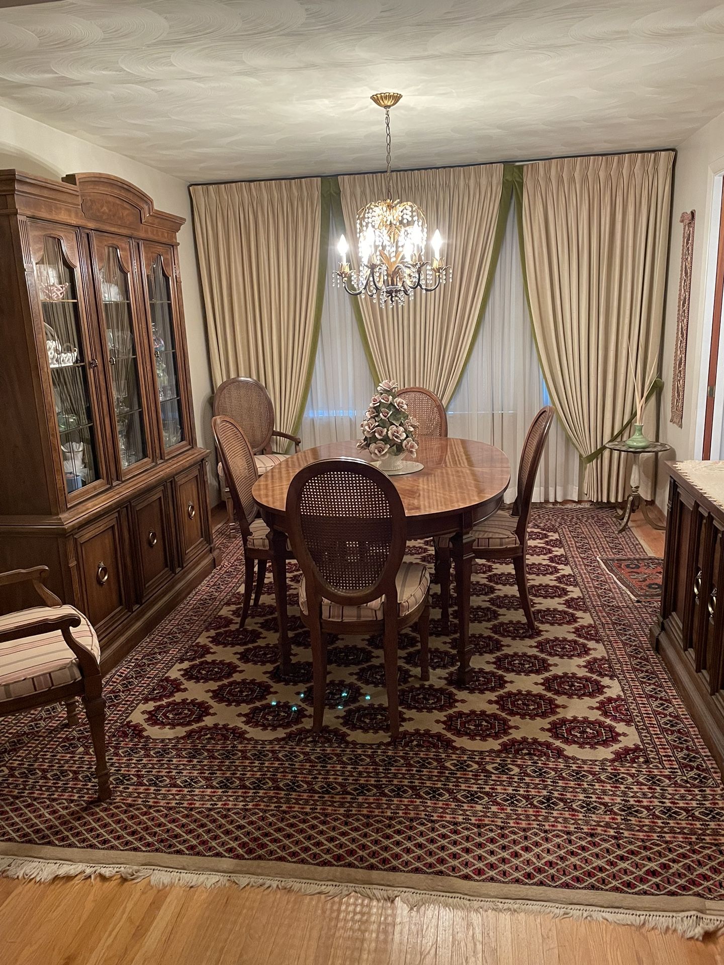 10 pieces. Table 6 chairs china cabinet serving buffet curio cabinet. Rug not for sale. Classic style. Pads included. Absolutely perfect condition.