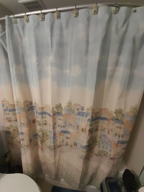 Cute shower curtain, soap dispenser, tissue box, and trash can.