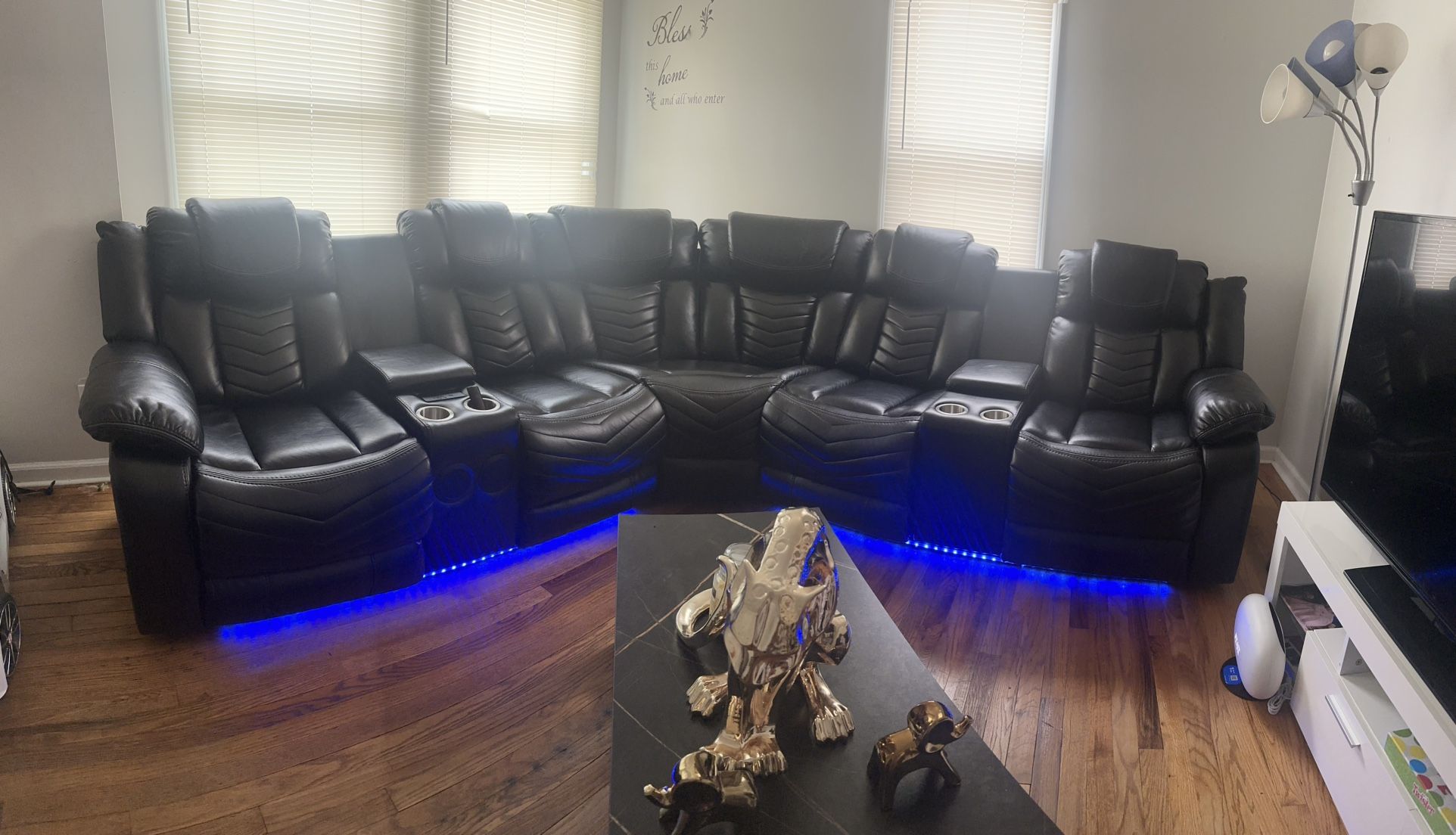 Black leather led sectional 2 recliner usb charger port on the side of each recliner, 2 storage pouches nect to both recliners