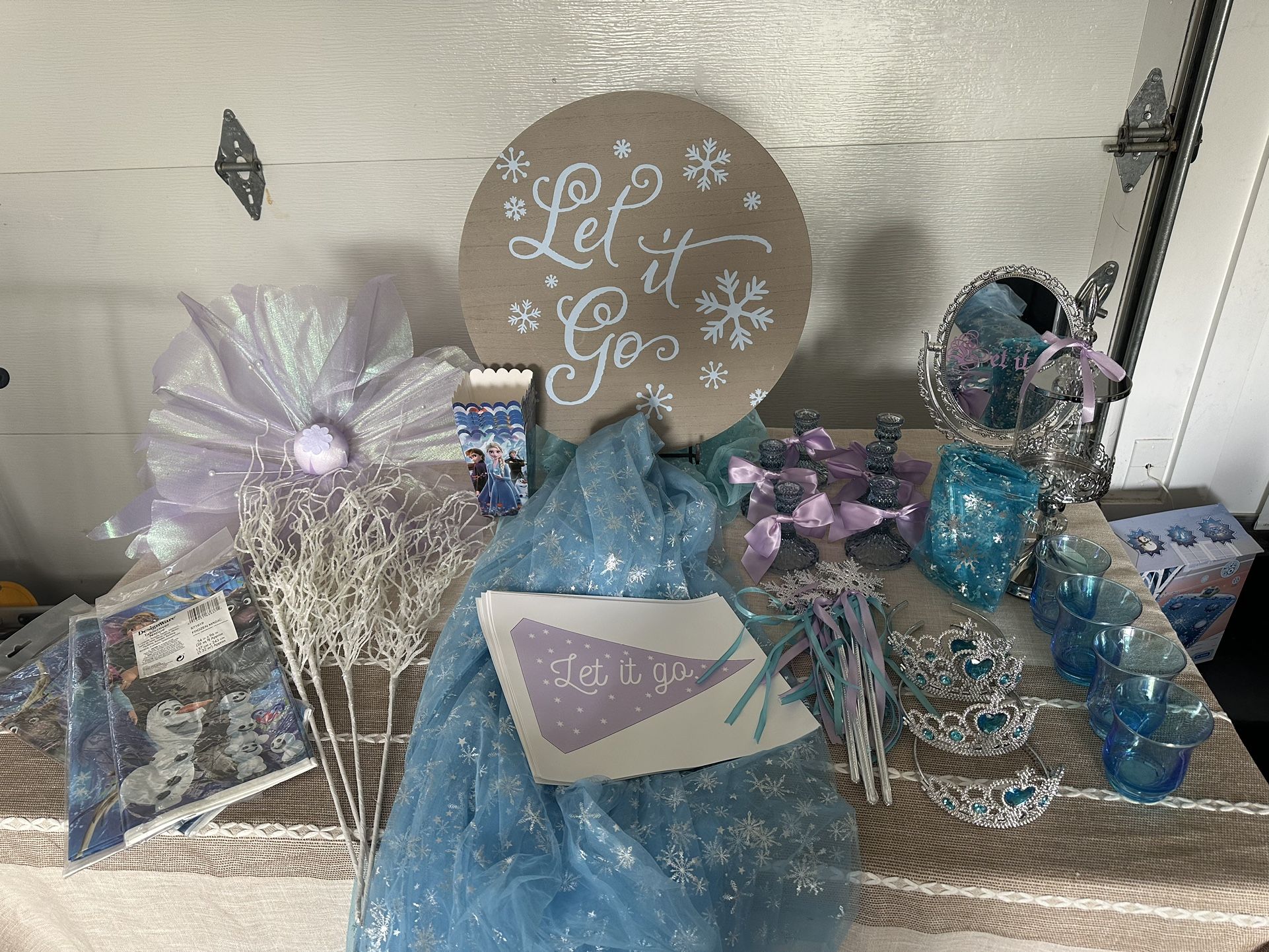Frozen decor for party. Wooden decal sign 3 table covers 6 candlestick holders Let it go mirror 6 Snowflake table runners 4crowns 6 wands 12 small snowflake treat bags 4 tea light candle holders 1 misc item holder/ candy container 6 treat or snack container 9 pennant flags printed on quality paper 4 white glittery branches 1 large purple blue glittery fabric flower