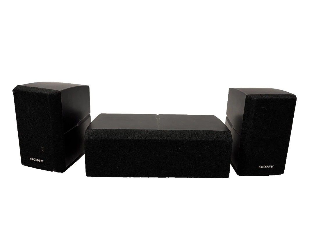 SONY SS-CNP2 (1) & SS-MSP2 (4) SURROUND (5) SPEAKERS SYSTEM with stands black, designed for home audio systems. With wired connectivity, these speakers come with stands Atlantics (stady metal) and speaker wire for easy setup. The Sony brand ensures quality and reliability in delivering clear and powerful sound. Perfect for enhancing your TV viewing or music listening experience, these speakers are a great addition to any home audio setup.