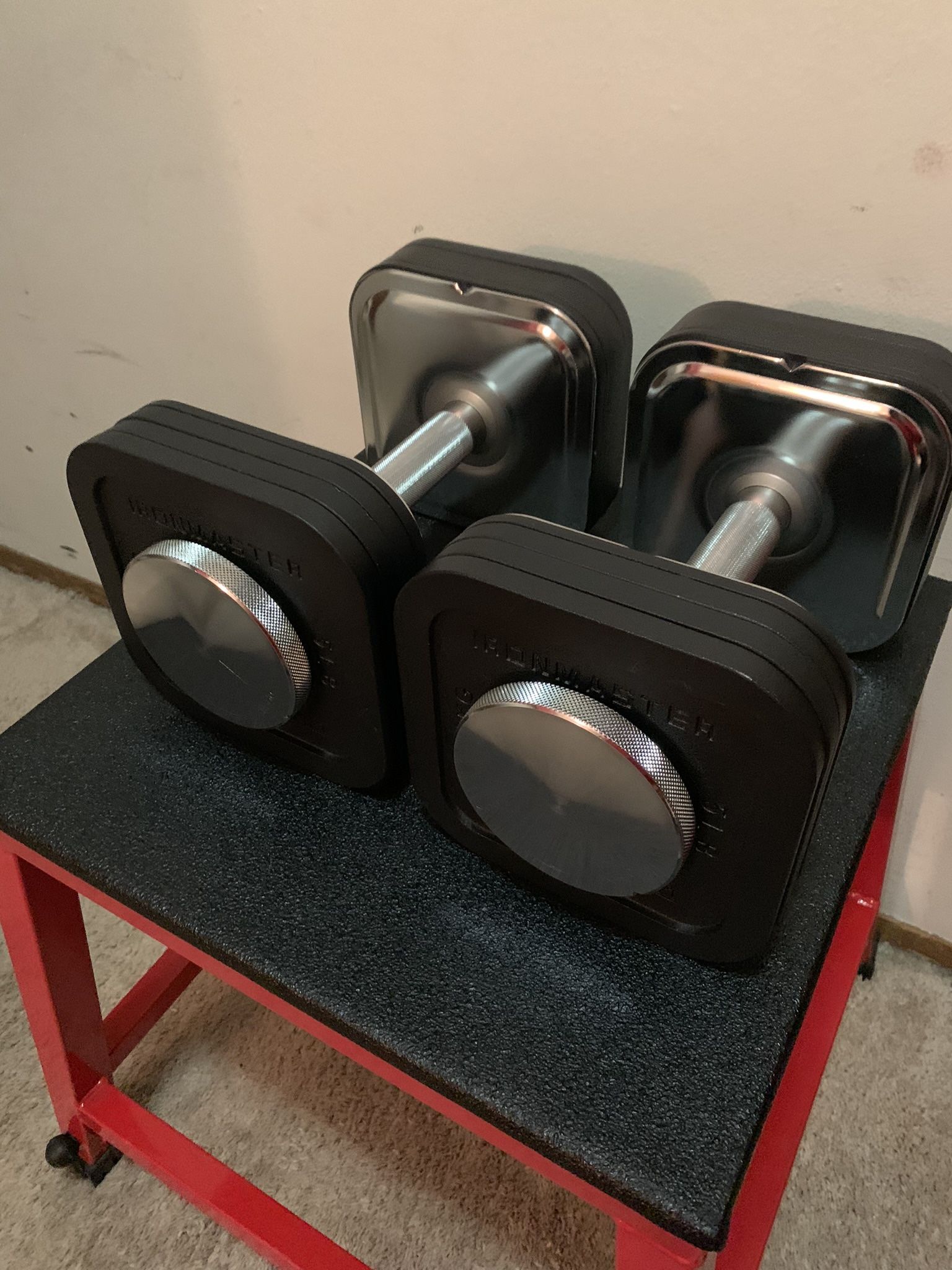 $569 plus Tax From the Ironmaster site: Features: • Adjust from 5–45 lbs each in 2.5 lb increments in just seconds • Compact and efficient — change weights on any flat surface (stand sold separately) • Includes two handles, four locking screws, twelve 5 lb plates, and four 2.5 lb plates • Each handle weighs 5 lbs; each locking screw weighs 2.5 lbs for a 10 lb base per dumbbell • Heavy-duty design feels solid with no rattling or looseness • Chrome-plated steel handles with diamond knurled grips • Built tough — no plastic or fragile parts Keywords: Weights Barbell Set Dumbbell Rack Fitness Kettlebell Bench Weight Olympic Standard Adjustable Weightlifting Powerlifting Barbells Kettlebells Dumbbells PowerBlock Bowflex Rack Squat Bench Power Cage Stands Boxing Ironmaster Rogue Hex Trap Bar Concept Rower PowerBlock Boxing MMA