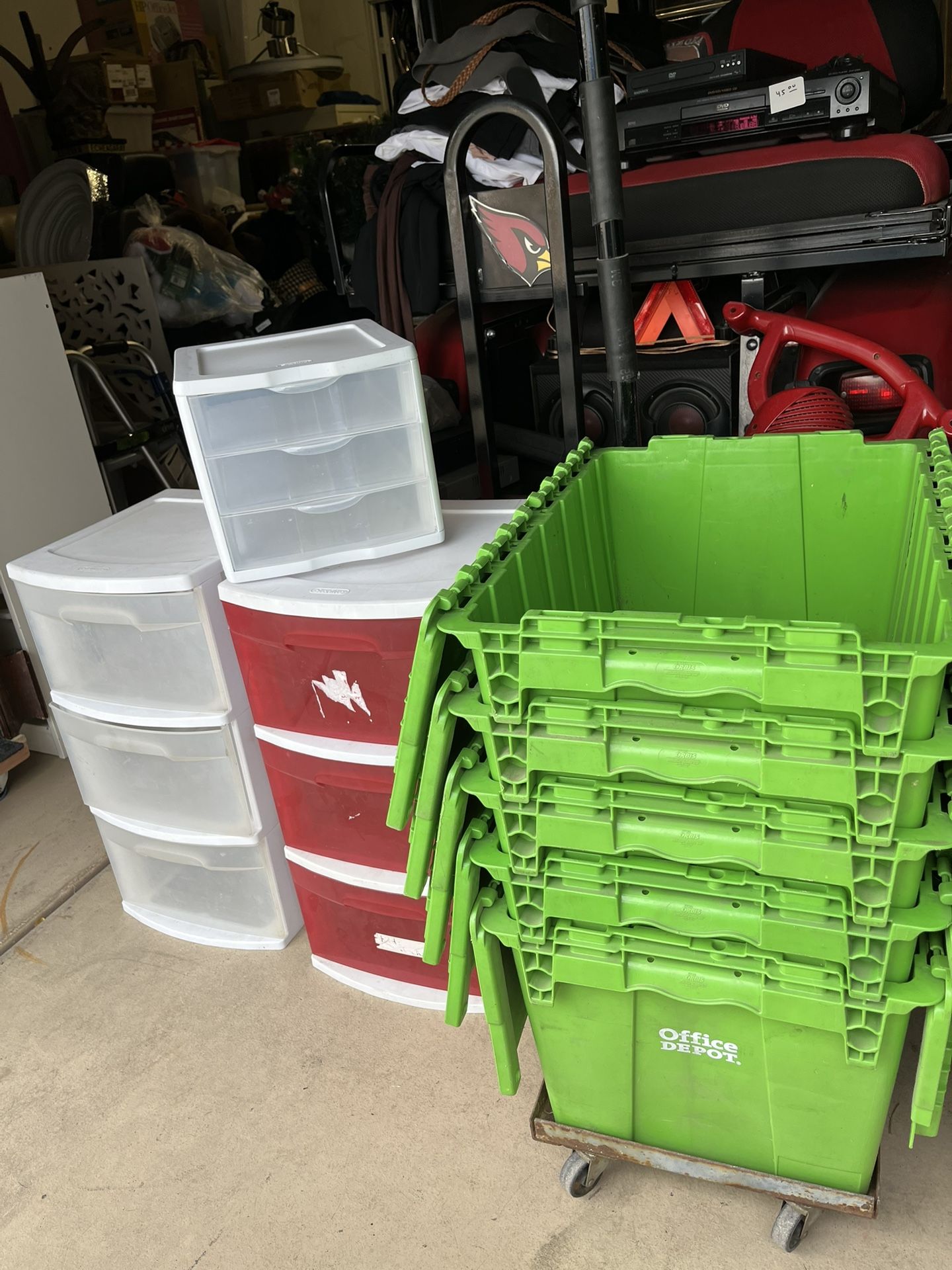 $5 Red bin with 3 Drewer, $5 Clear bin with 3 drawers, $5 for smaller 3 drawers bin, $20 for the white 6 pull out drawers, Have 20 right now but they go fast. Located on 27th avenue and Baseline . All green bin have sold