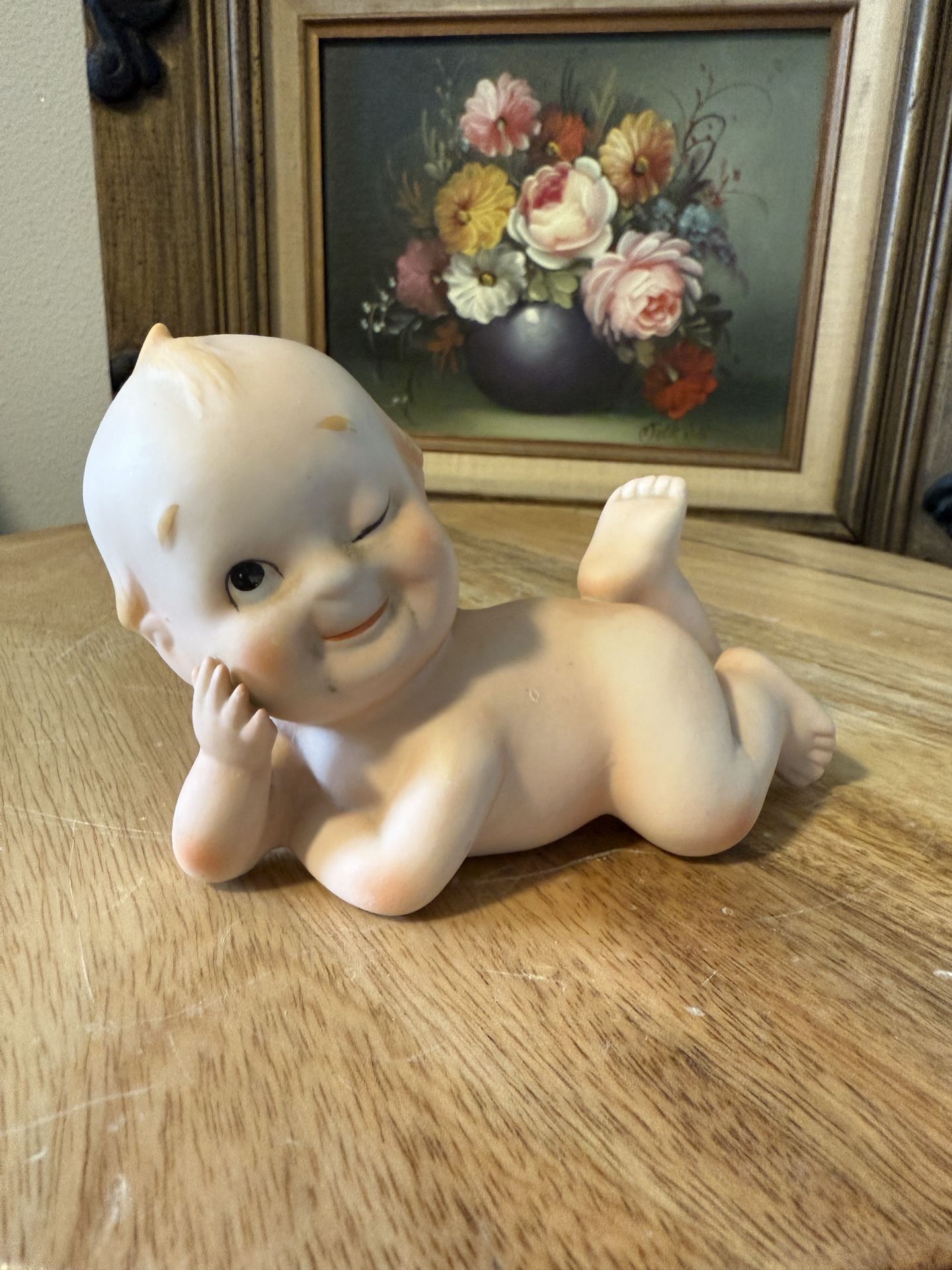 In great vintage condition, no chips or cracks. Marked “KW 228” on bottom. Measures approximately 3” tall by 4.75” long. Adorable kewpie lying down with one foot kicked up, winking with a little hand up to their cheek. Has 2 blue wings on its back. Made of bisque porcelain. Kewpie dolls originated from O'Neill's comic strip characters, which first appeared in 1909. They are characterized by their cherubic, baby-like appearance with a distinct topknot of hair, large eyes, rosy cheeks, and a smile.