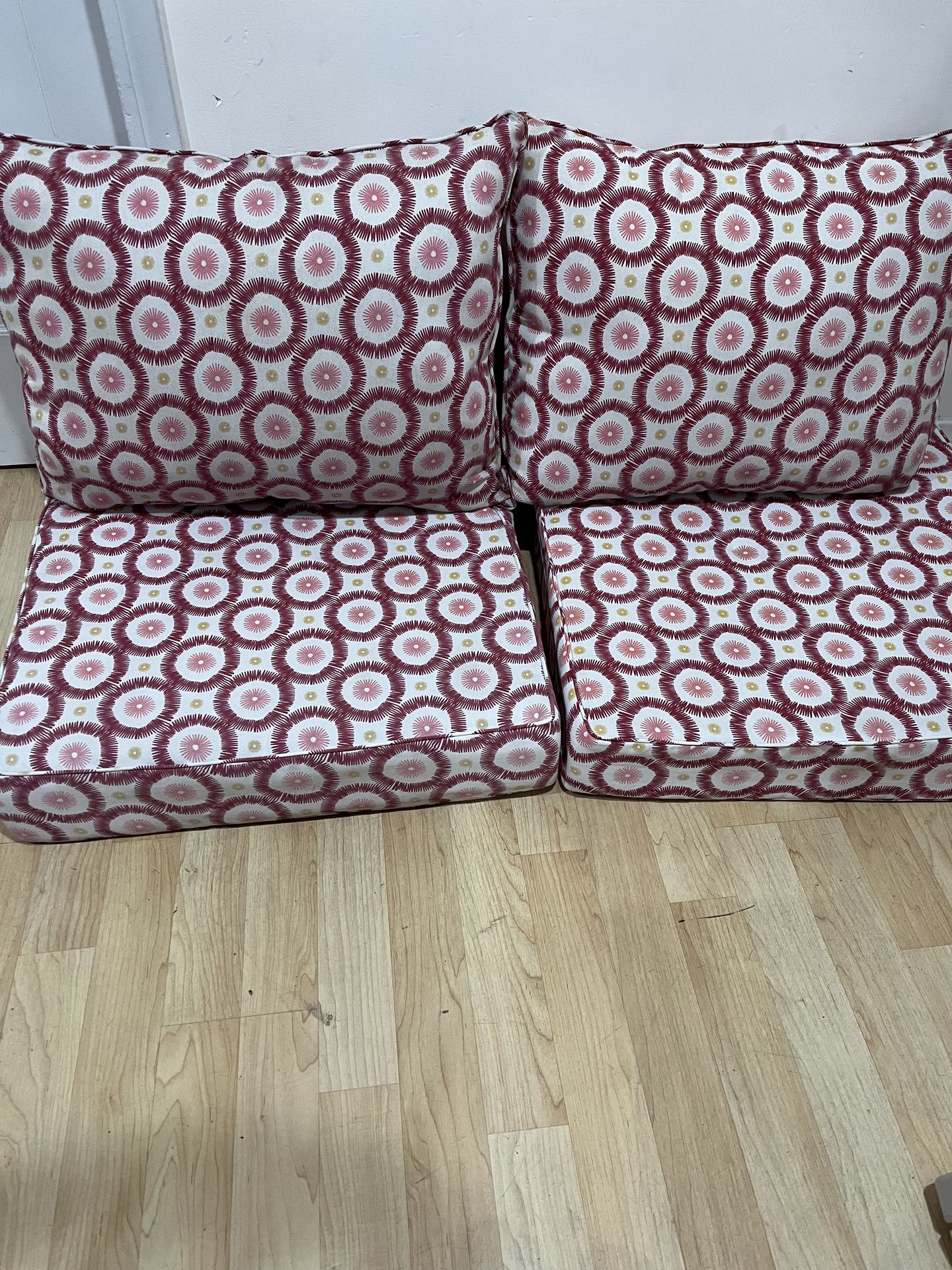Measurements are 25” x 25” x 5”. Included 2 back and 2 seat cushions. Brand new.