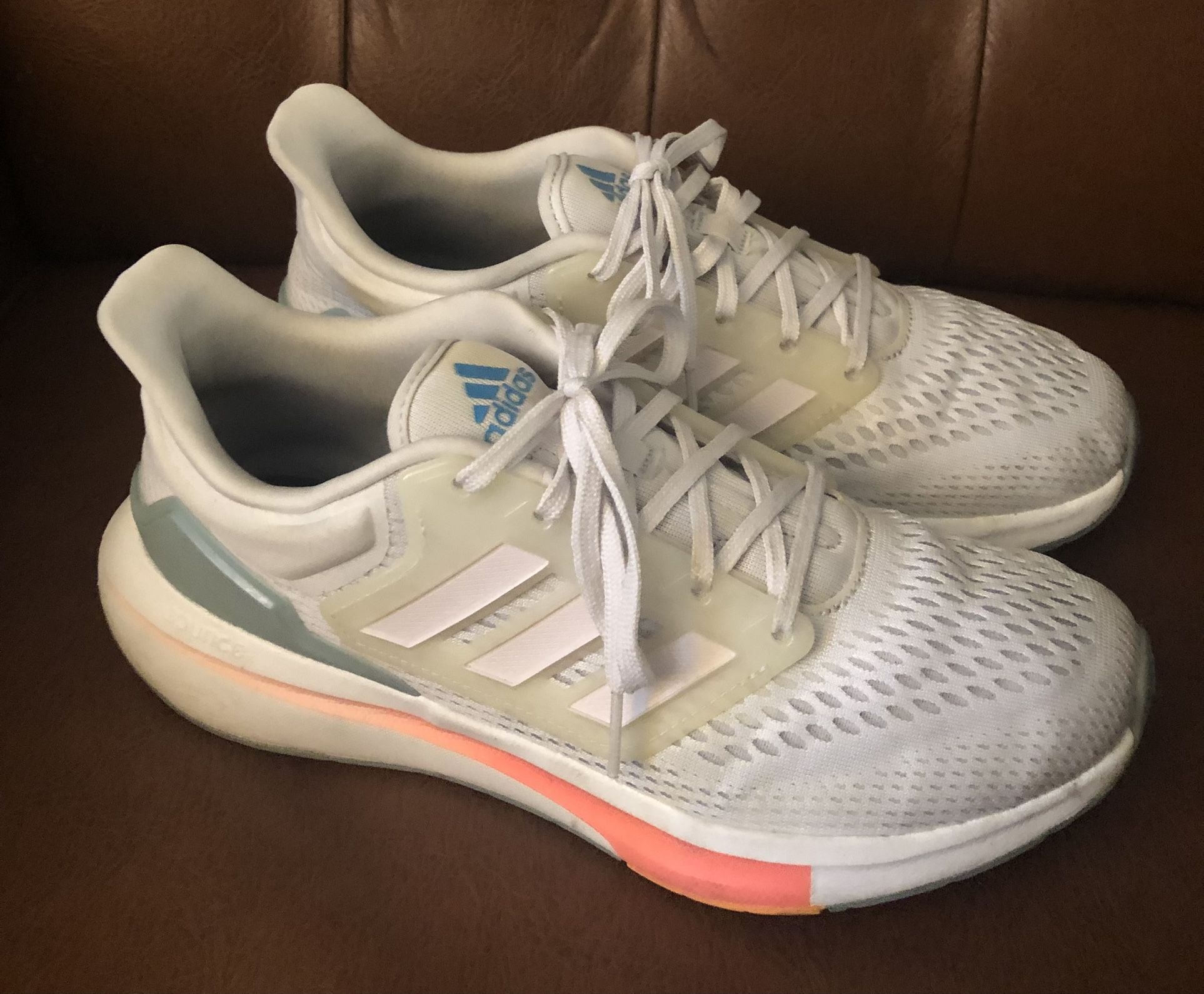 Adidas Bounce sneakers Performance EQ21 running shoes Light dash gray, dark gray, white, and bright pink Women’s Size 8 Regular fit Lace up closure Engineered mesh upper Padded collar TPU quarter and heel stabilizers Bounce cloud foam midsole 12/ 2021 Style code # GZ0588 They are perfect for walking, running, and jogging. Very good used condition!