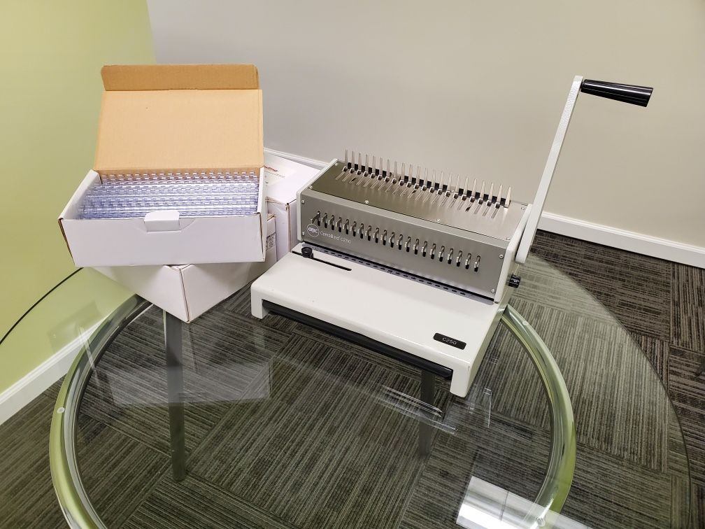 GBC COMBBIND C250 with 100 - 3/4", 100 - 9/16", 50 - 1" clear combs + 50 - 2" blue combs. $150