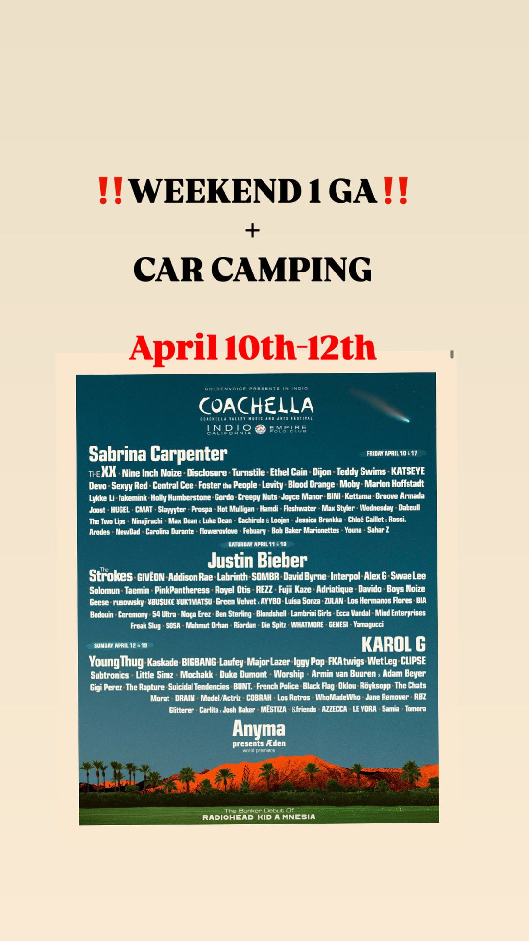 COACHELLA WEEKEND 1 GA + CAR CAMPING