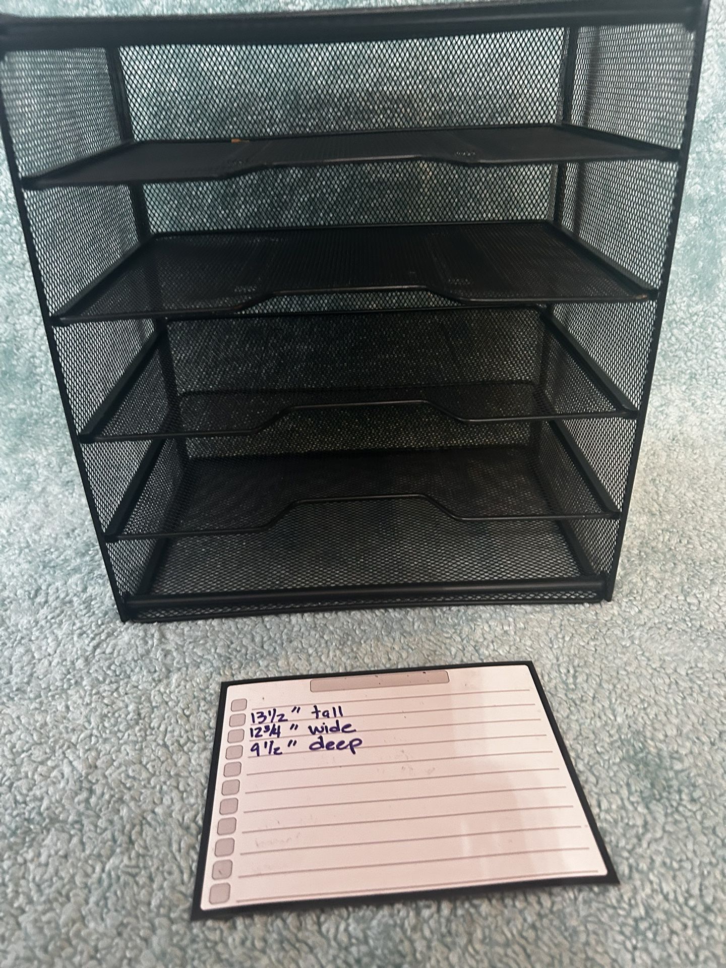 Black metal desktop organizer. Dimensions in the photo. I actually have two of these. Works great just trying to downsize and sell items we no longer $10 each or both for $15