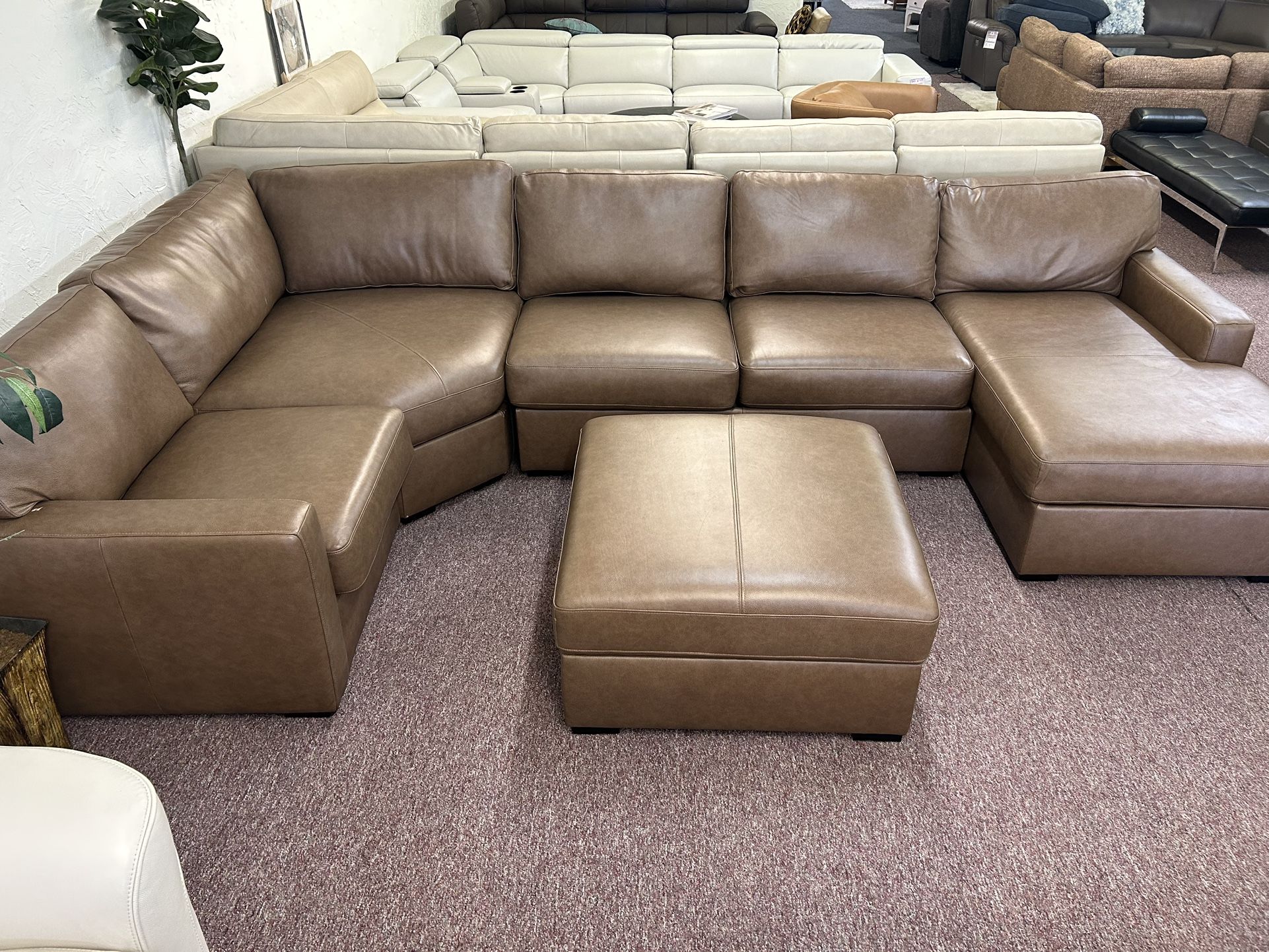 Sectional: 136"W x 73"D x 35"H $1,999 Ottoman: 36"W x 36"D x 20"H $399 Retail price Sectional: $5,426 Ottoman: $729 A buttery leather draped minimalistic modular sectional with a chaise that gives both aesthetics and comfort to a cozy living room. The nicely filled cushions with the bold arm makes the Radley a customer favorite and first pick. Delivery available Financing available Store display item
