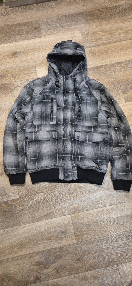 Authentic G-Star RAW insulated jacket. Size Large. Cotton shell with warm insulated lining. Hooded. Stylish plaid design. Very good condition. All buttons and zipper work perfectly. Retail $200+. Selling for $50. Open for offers.