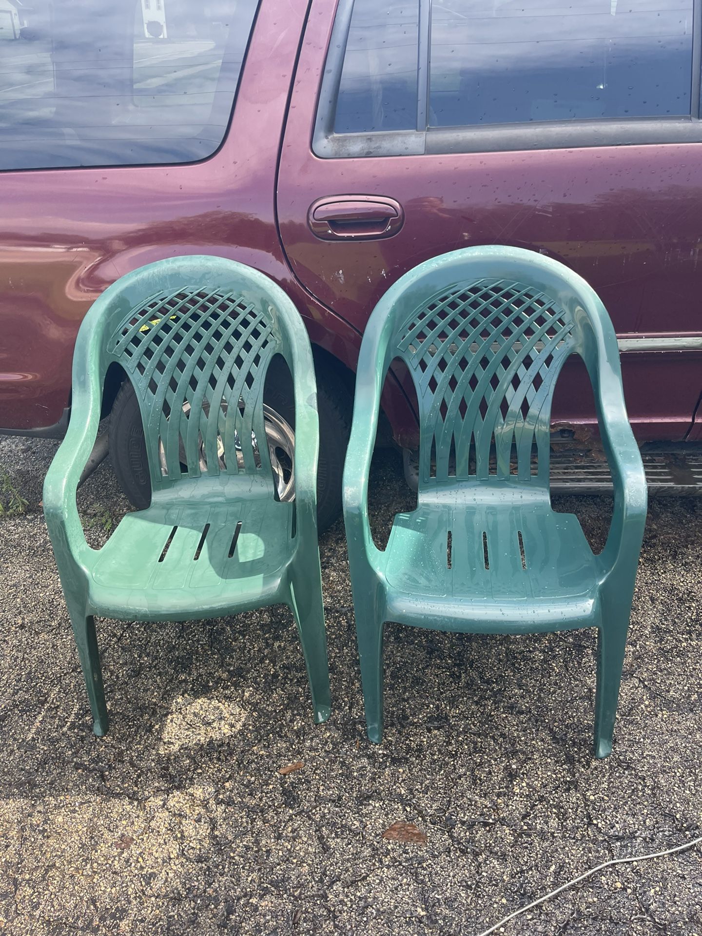 These are 2 great green plastic chairs it good condition for your patio or porch or wen family comes to visit you just enjoy sitting outside with a glass or drink selling both for $40