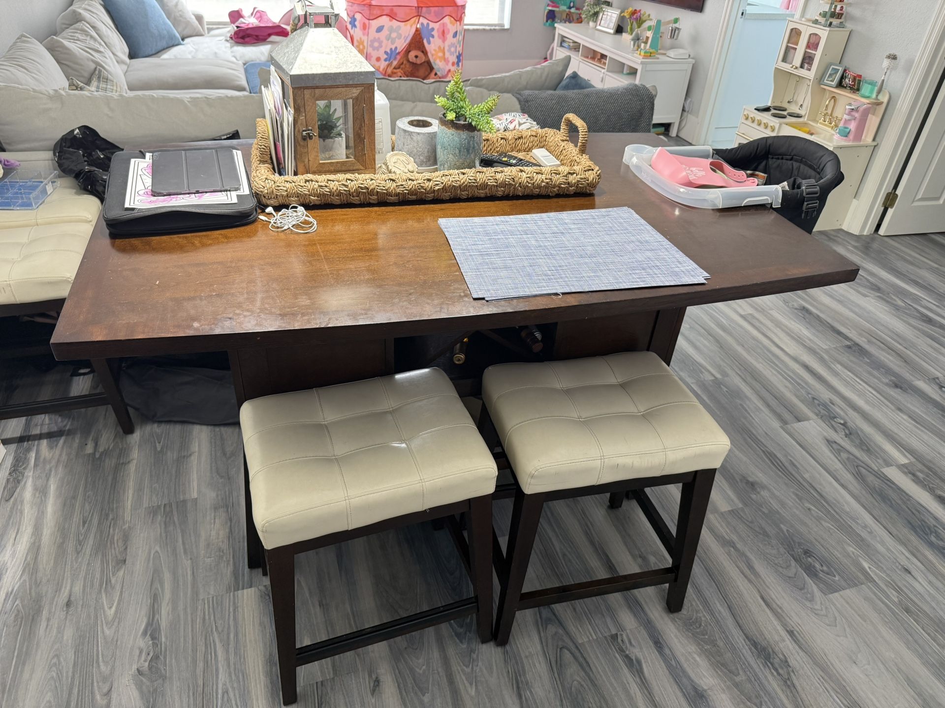 4 stools, and a 2-seater bench. Wine storage, and misc open rack storage below. 62 inches in length 38 1/2 wide 3 ft in height Color espresso