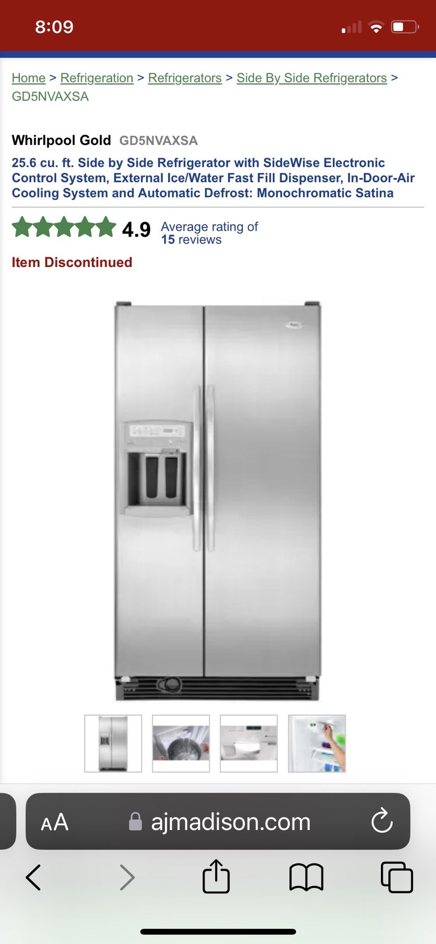 For sale stainless steel Whirlpool Gold GD5NVAXSA 25.6 cu. ft. Side by Side Refrigerator Paid over $1800 Selling for $700 in used condition everything works. Thank you, Robert
