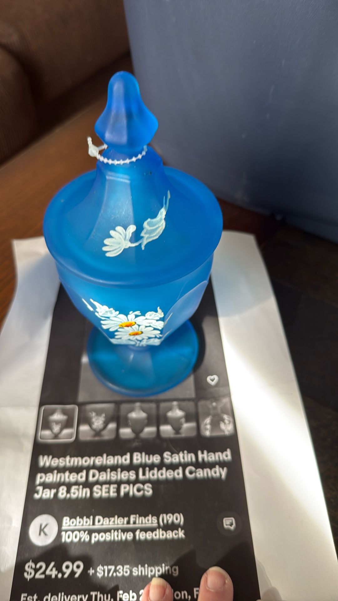 Westmoreland Blue satin hand Painted daises lidded candy Jar 8.5in