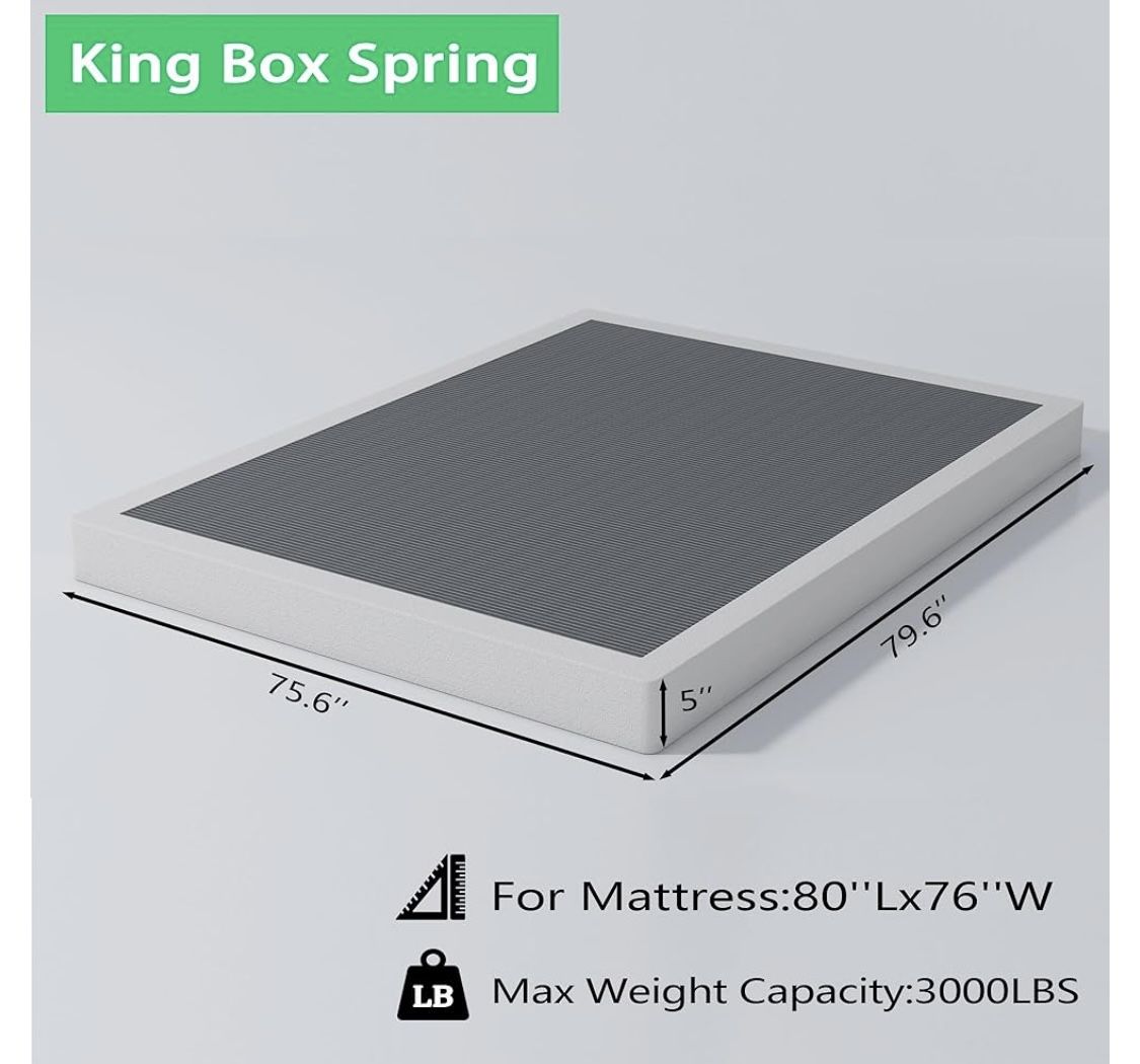 5” king bed box spring. Metal. New in box. Never opened. Waited too long to return. My loss your gain!