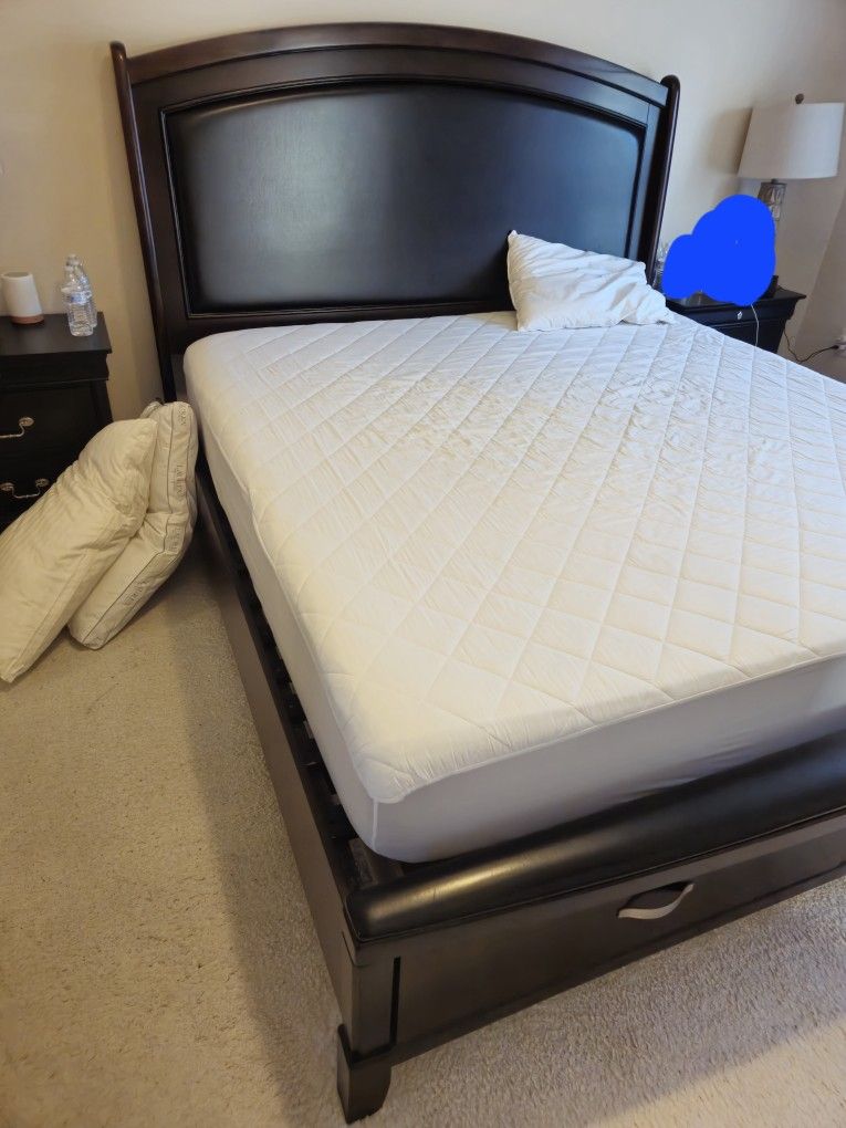 King Size, wooden, Black storage bed frame for sale. Does not need a box spring. No scratches, or structural damage. 2 matching bed side stands available - each $100 (sold separately from the bed)